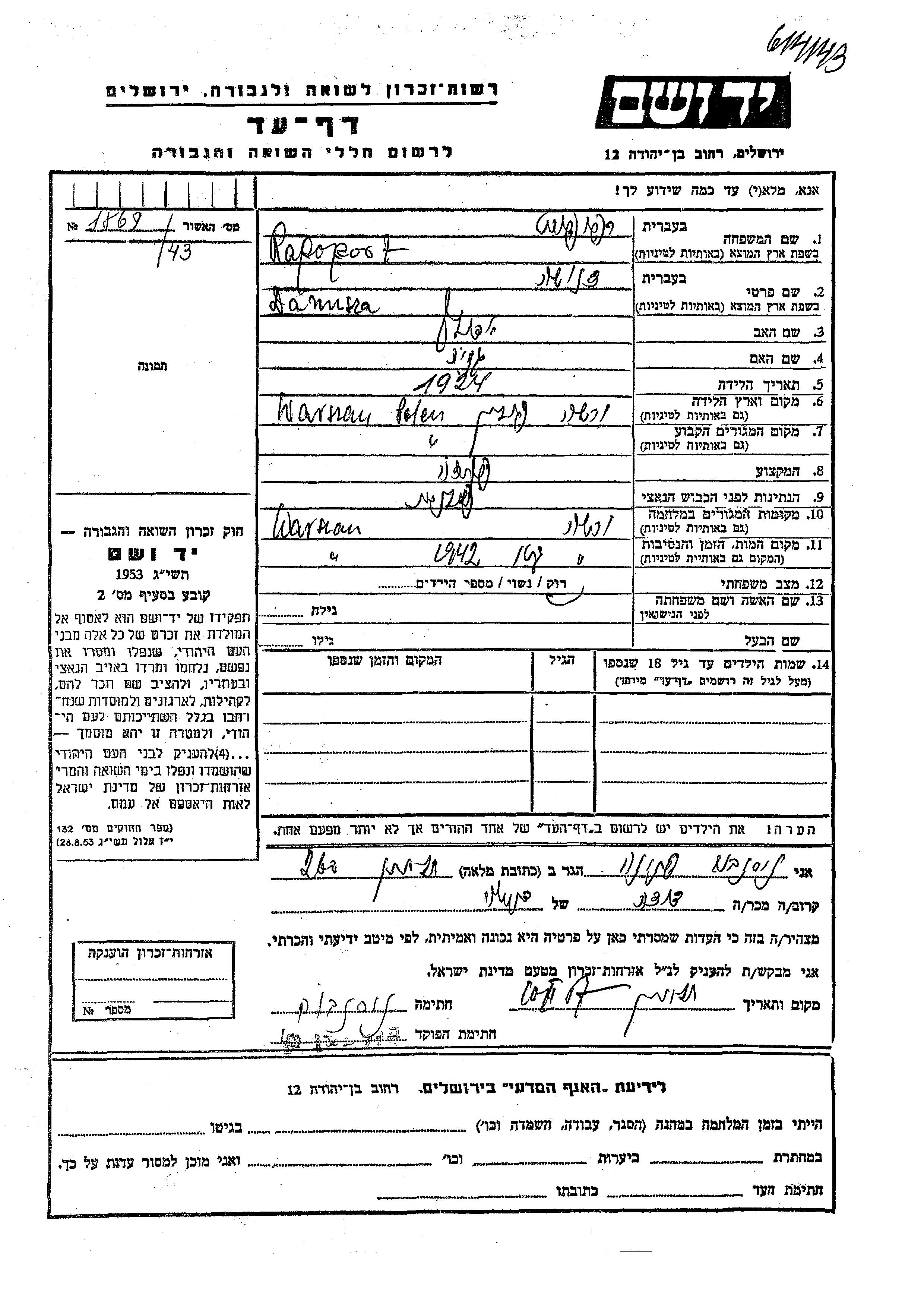 Дануша Данута Рапапорт, место рождения: Варшава, Польша. Отец: Адольф, mать:Геня. Клерк. Холост / не замужем. Место жительства до войны: Варшава, Польша. Место во время войны: Варшава, Польша.