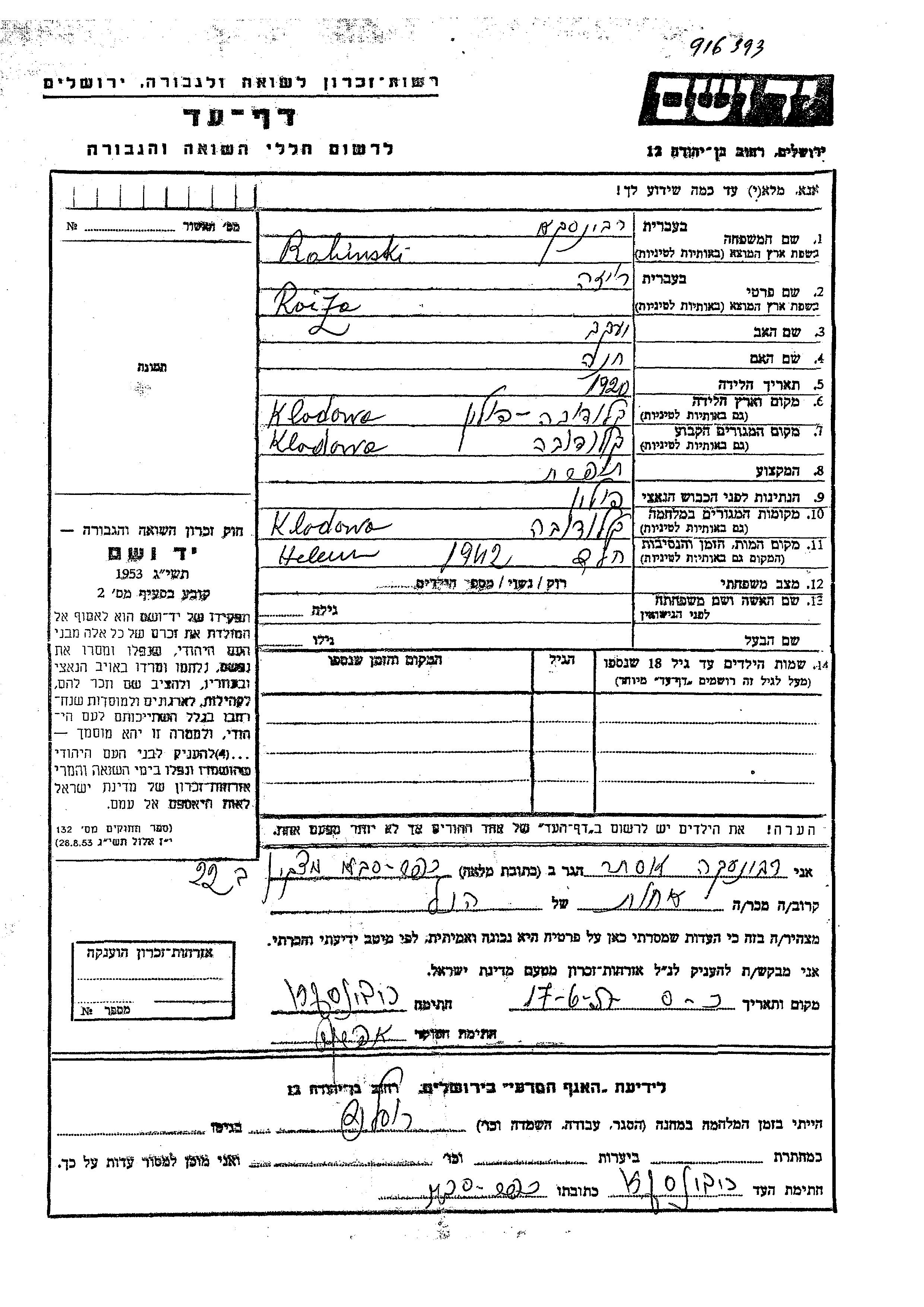 Рабински Ройза 1920 Клодова, Польша Лист свидетельских показаний