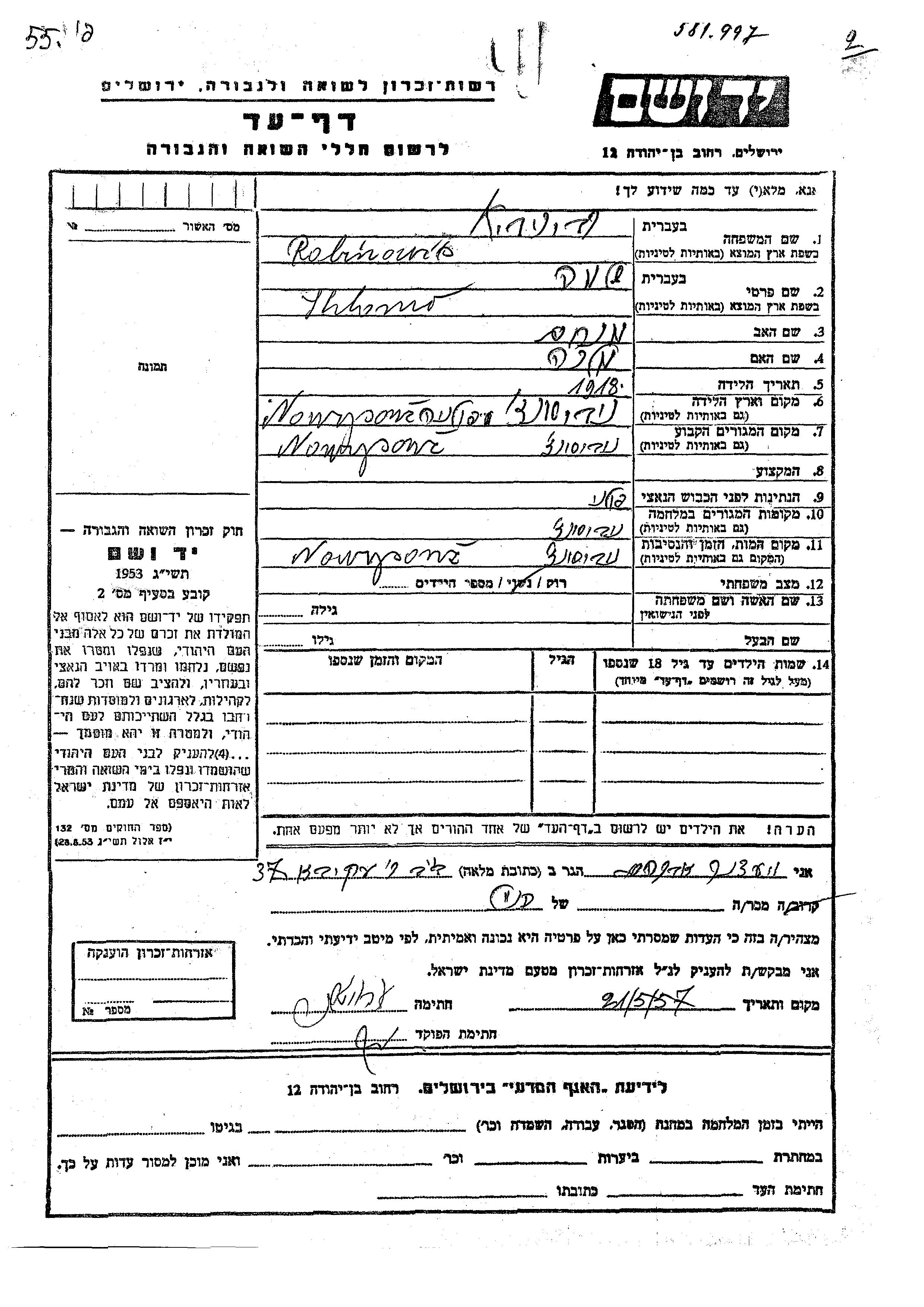 Рабинович Шломо 1918 Новы-Сонч, Польша Лист свидетельских показаний