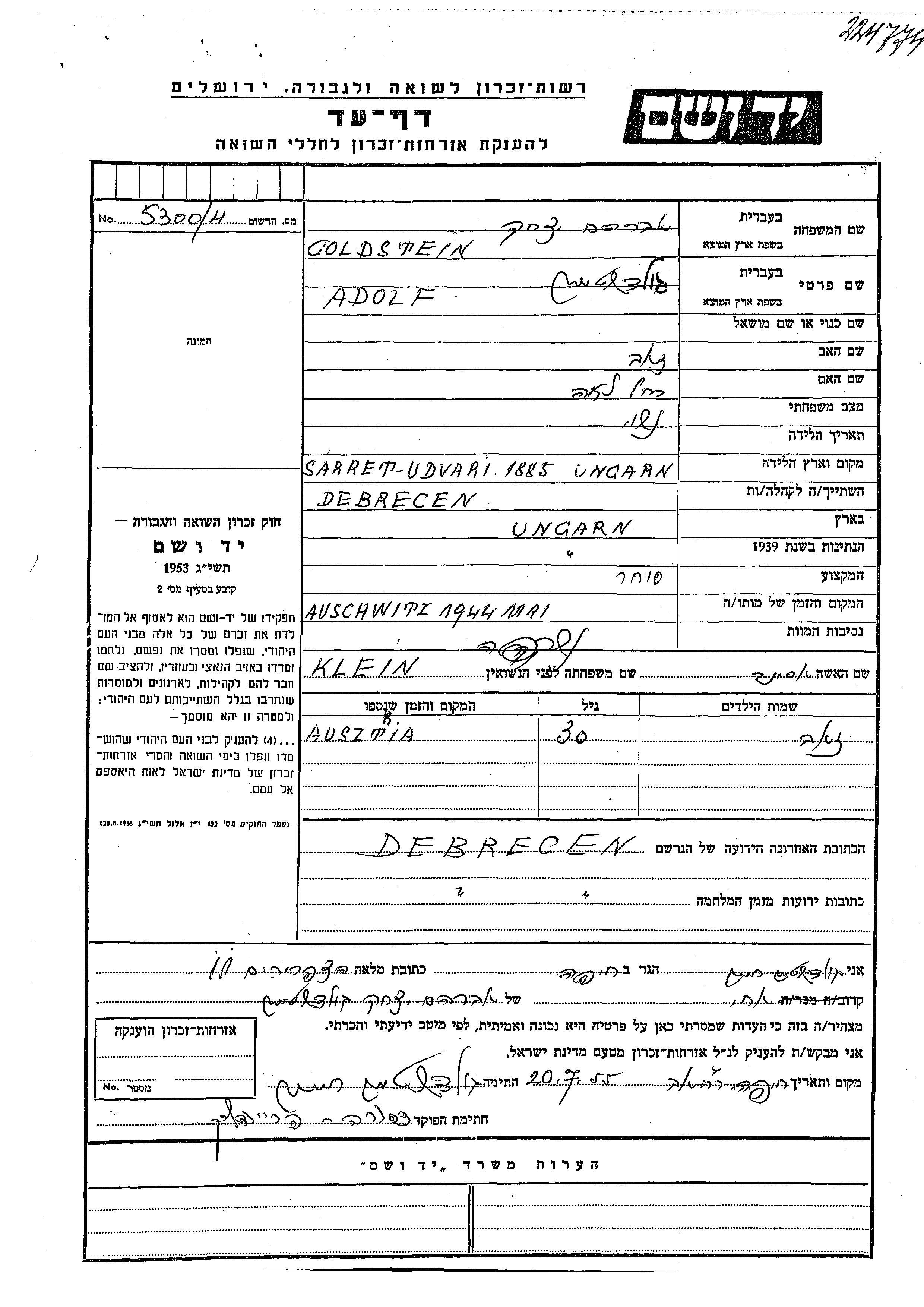 Адольф Гольдштейн, место рождения: Шарретудвари, Венгрия. Отец: Вольф, mать:Луиза. Женат / замужем. Место жительства до войны: Дебрецен, Венгрия. Место во время войны: Дебрецен, Венгрия.