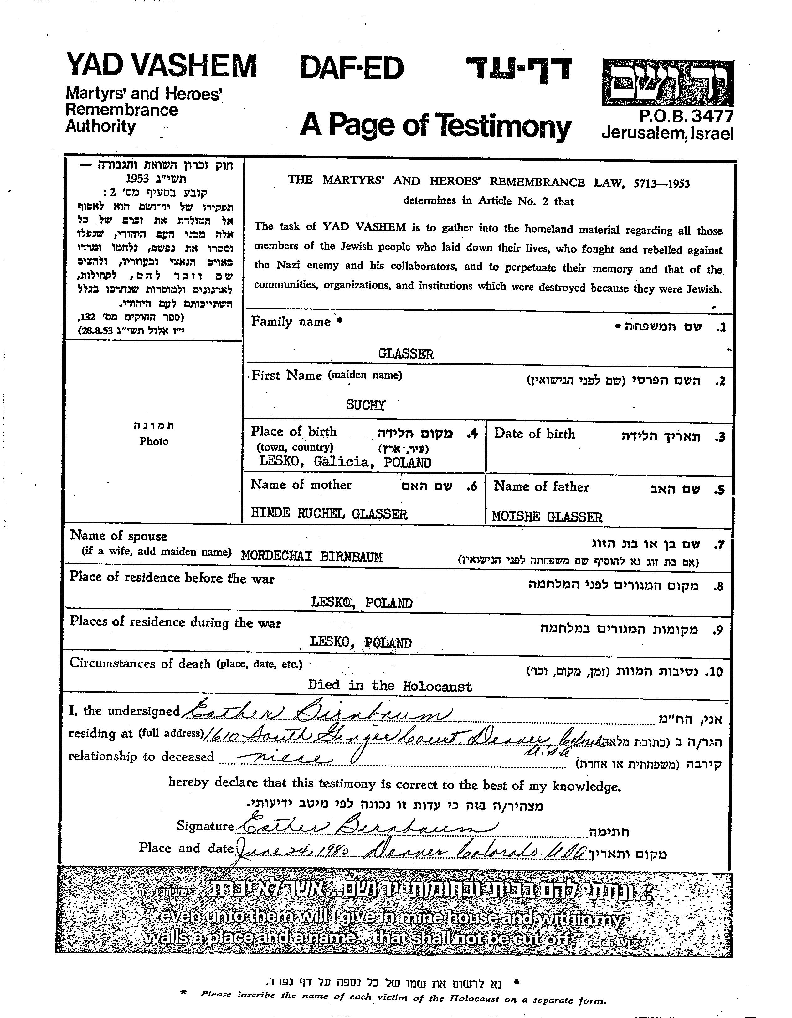 Сухи Глассер, девичья фамилия Бирнбаум, место рождения: Леско, Польша. Отец: Мойше, mать:Хинда Рухель. Женат / замужем. Место жительства до войны: Леско, Польша. Место во время войны: Леско, Польша.