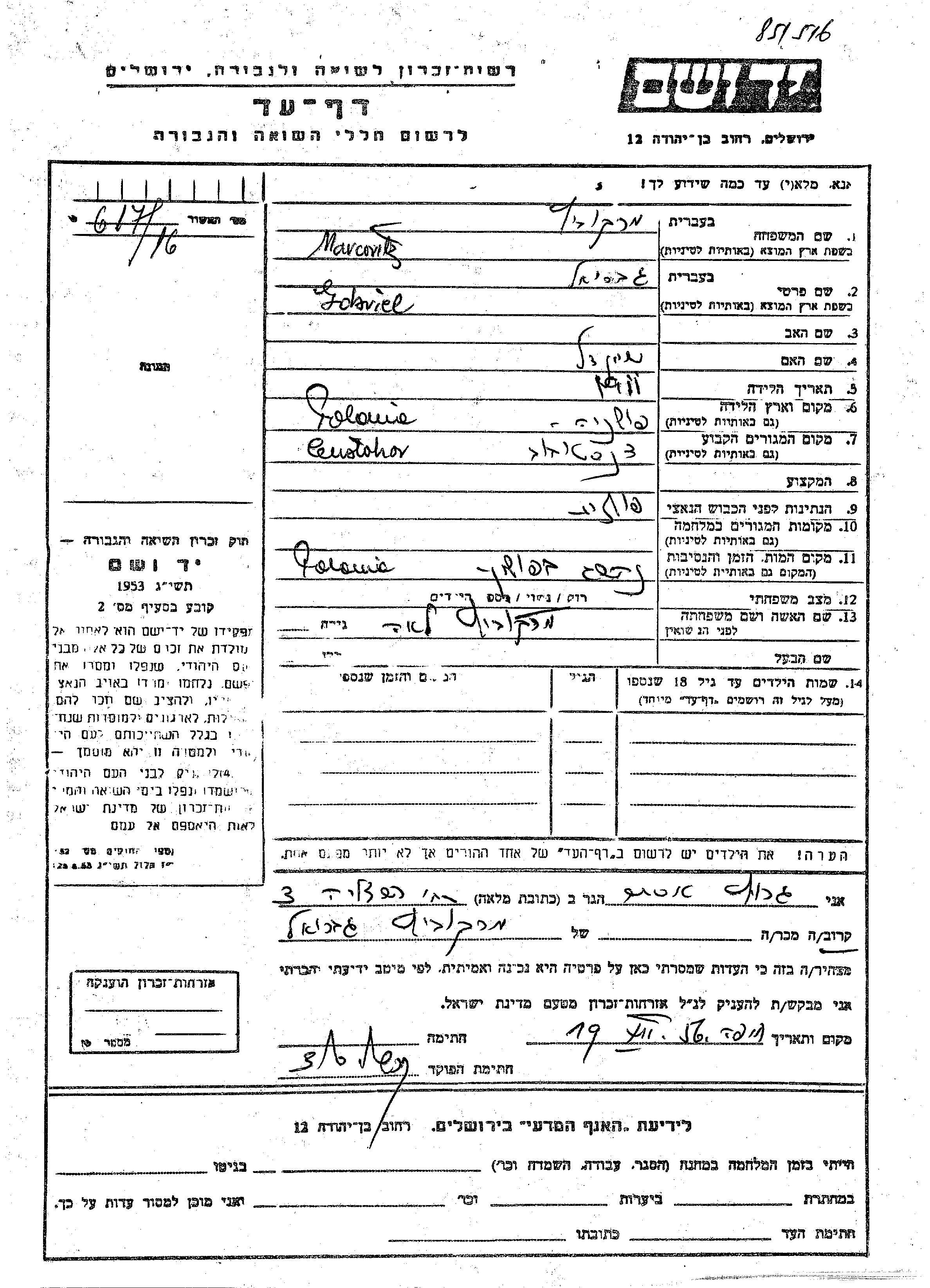 Габриэль Марковиц, место рождения: Польша.Mать:Шейндель. Женат / замужем. Место жительства до войны: Ченстохова, Польша.