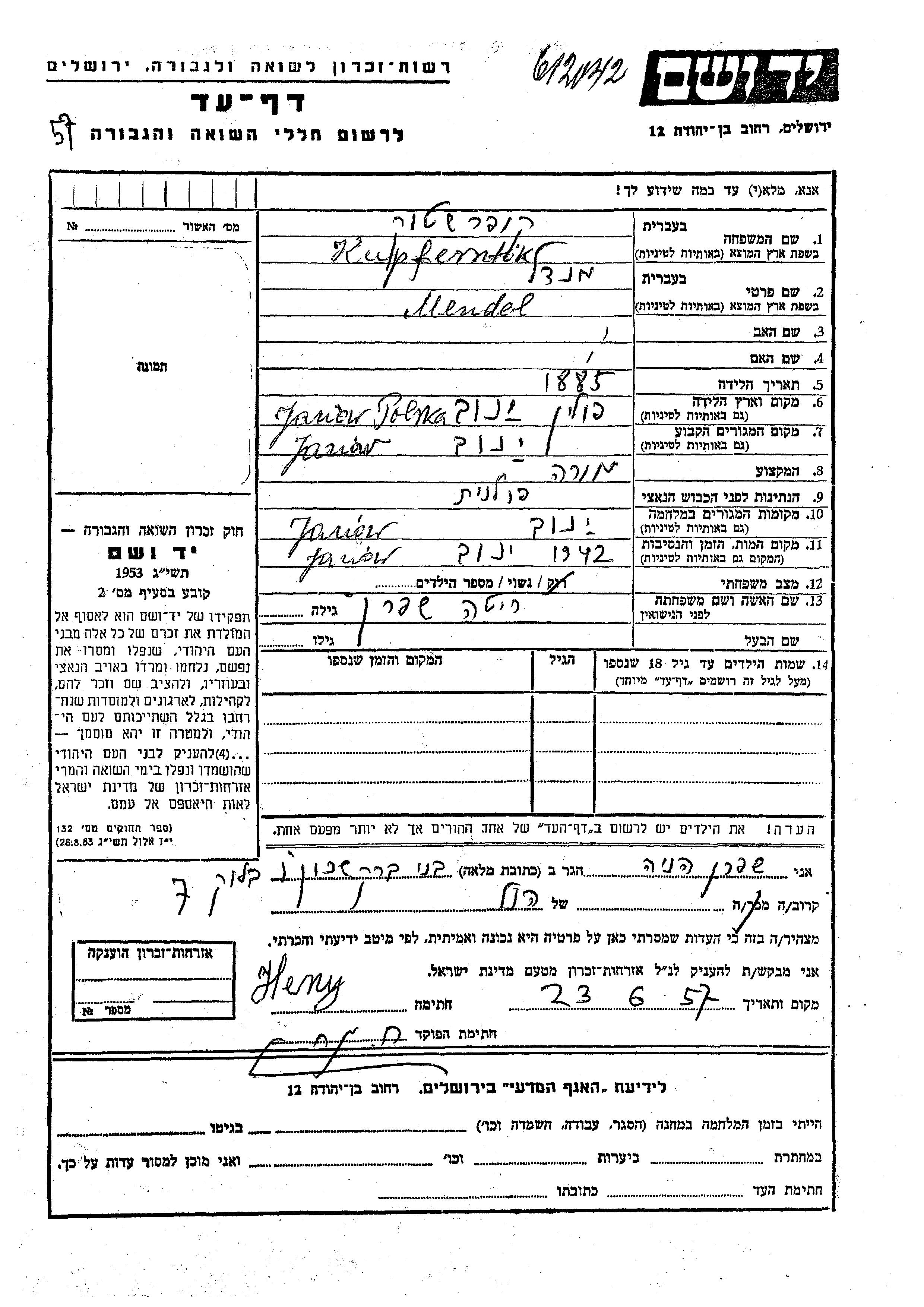 Мендель Купфершток, место рождения: Янув, Польша. Учитель / учительница. Женат / замужем. Место жительства до войны: Янув, Польша. Место во время войны: Янув, Польша.