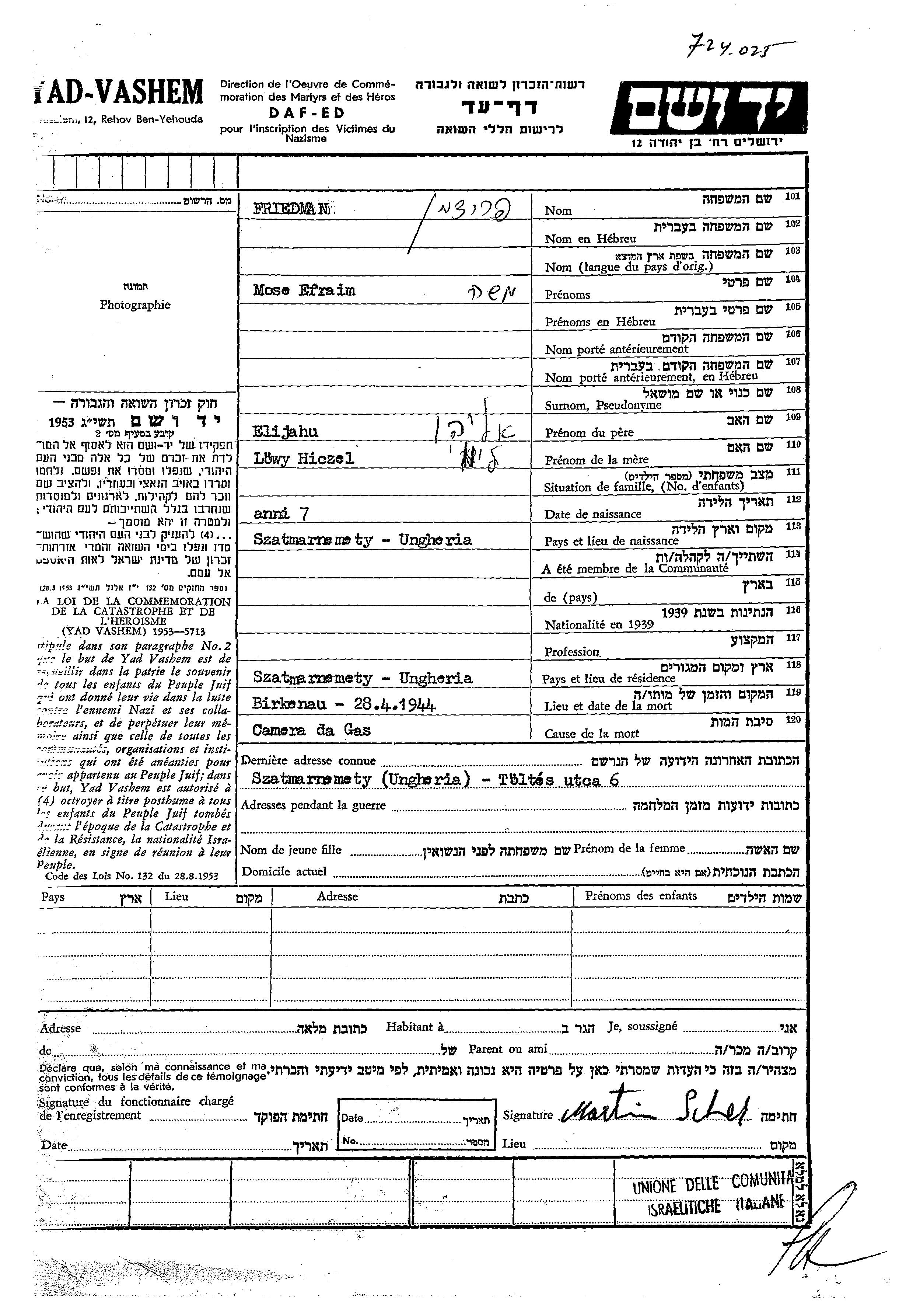Моше Эфраим Фридман, место рождения: Сатмарнемети, Румыния. Отец: Элияху, mать:Хицель, девичья фамилия Лёви. Ребенок. Место во время войны: Сатмарнемети, Румыния.