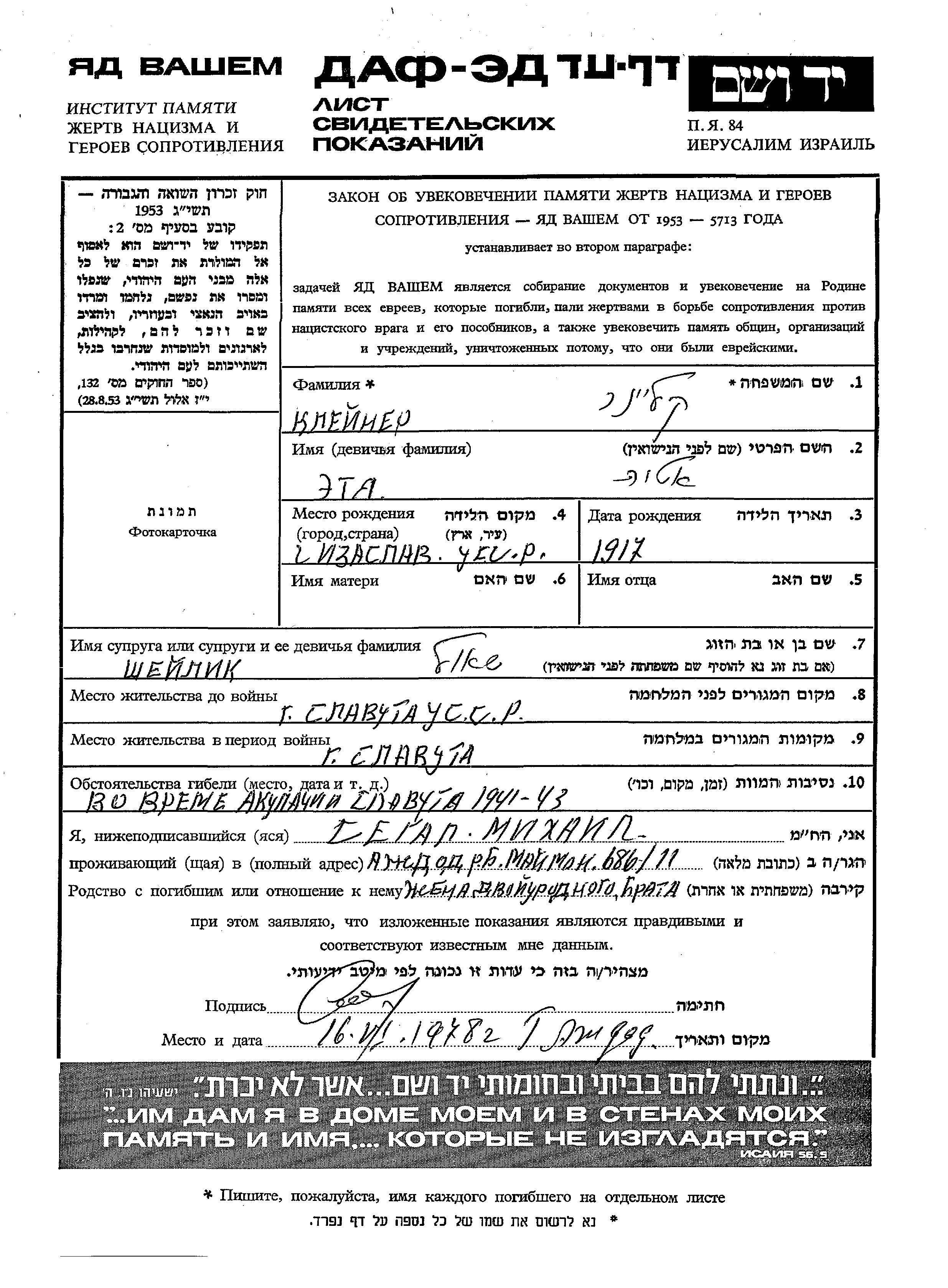 Клейнер Этя 1917 Славута, Украина (СССР) Лист свидетельских показаний