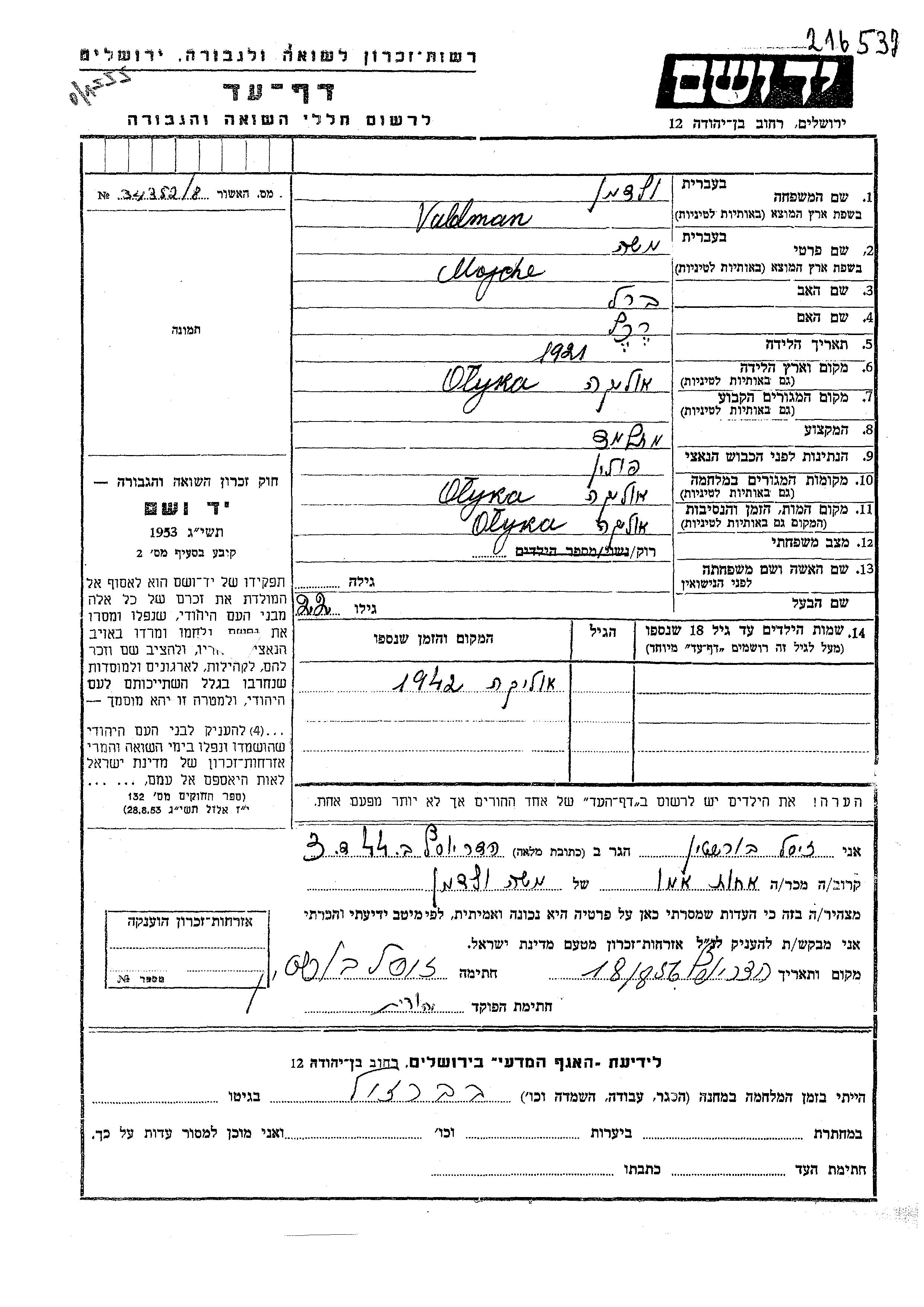 Мойше Вальдман, место рождения: Олыка, Польша. Отец: Берл, mать:Рехель. Ученик / ученица. Холост / не замужем. Место во время войны: Олыка, Польша.
