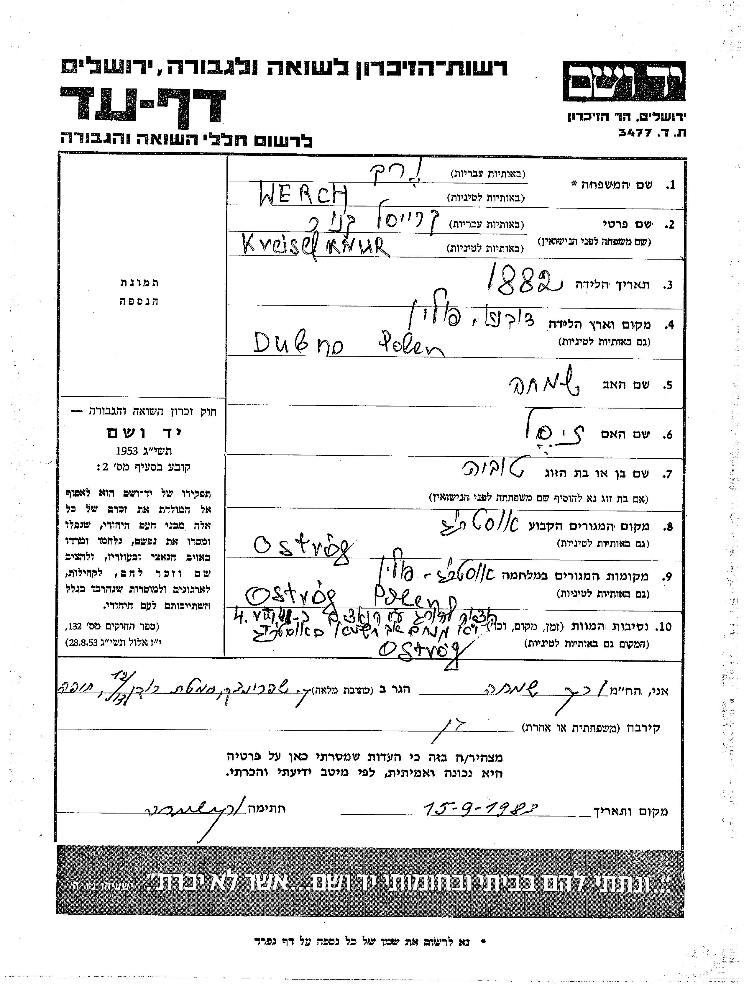 Крейсель Верх, девичья фамилия Кнур, место рождения: Дубно, Польша. Отец: Симха, mать:Зисл. Женат / замужем. Место жительства до войны: Острог. Место во время войны: Острог, Польша.