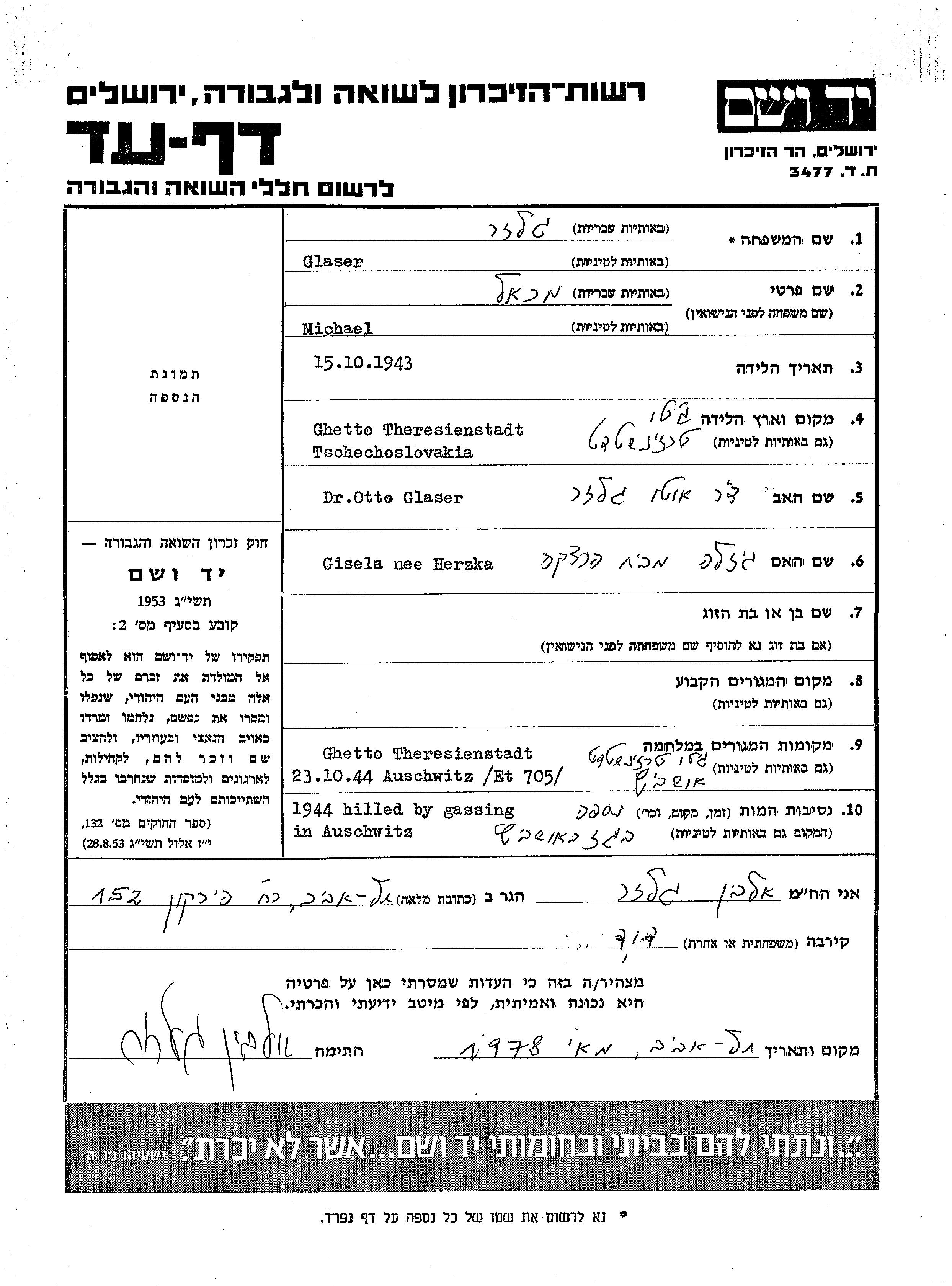 Михаэль Гласер, место рождения: Терезиенштадт, Чехословакия. Отец: Ото, mать:Гизела. Место во время войны: Аушвиц, Польша.