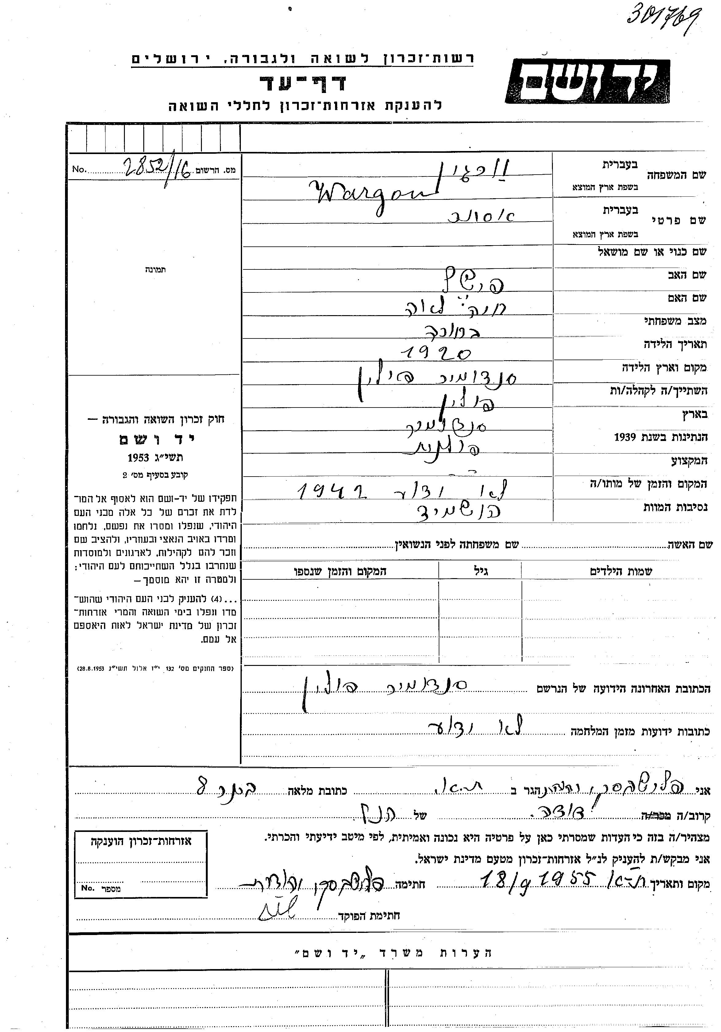 Эстер Варгон, место рождения: Сандомеж, Польша. Отец: Гершель, mать:Хая Лея. Холост / не замужем. Место жительства до войны: Сандомеж, Польша. Место во время войны: Сандомеж, Польша.