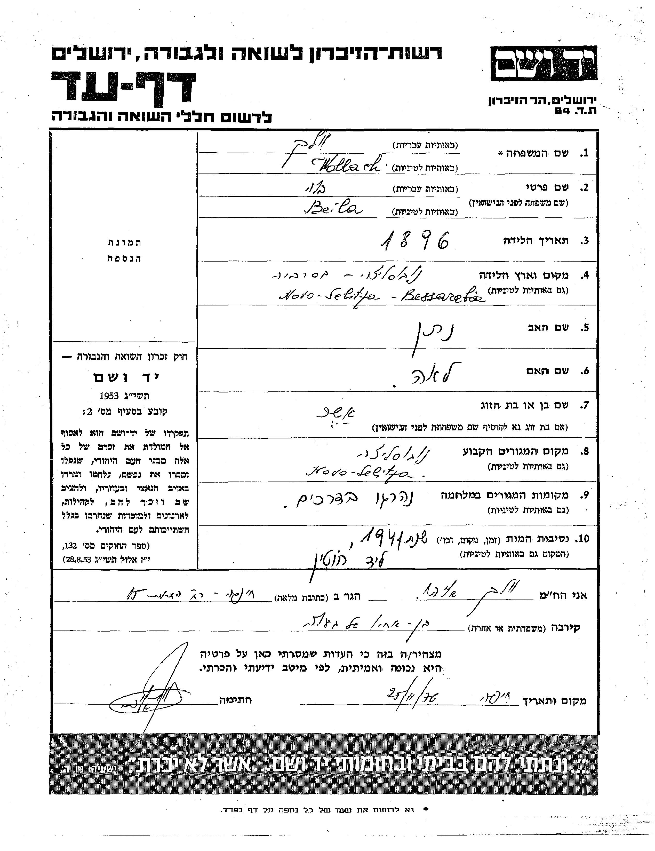 Бейла Воллах, место рождения: Бессарабия, Румыния. Отец: Натан, mать:Лея. Женат / замужем. Место жительства до войны: Новоселица, Чехословакия.