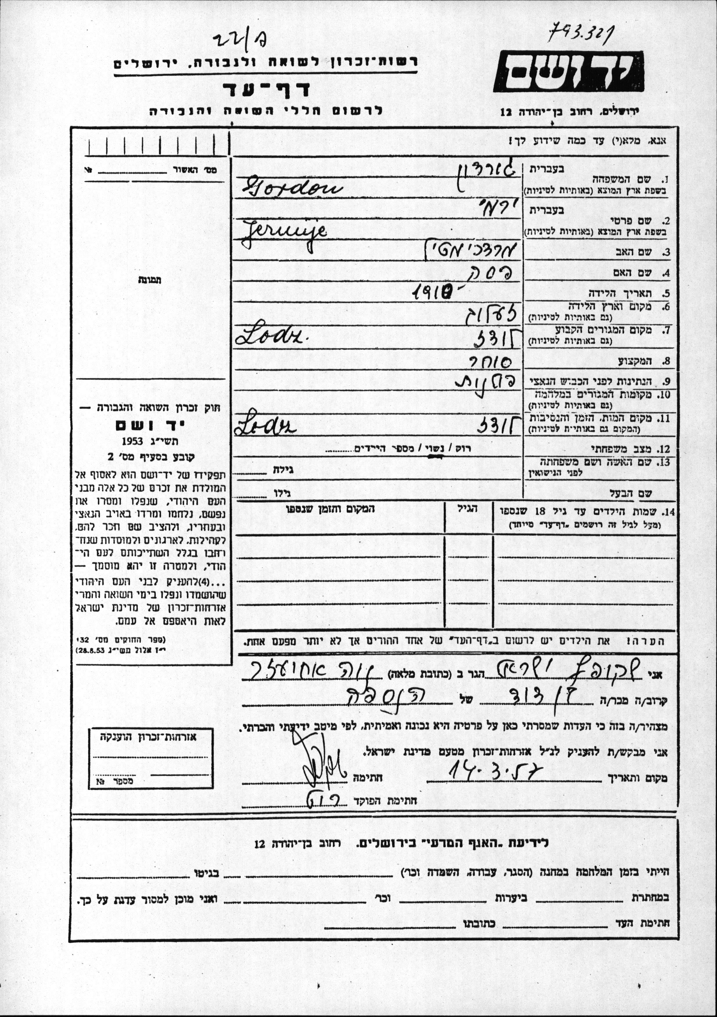Иеремия Гордон, место рождения: Зелув, Польша. Отец: Мордехай Матил, mать:Песа. Торговец / торговка. Женат / замужем. Место жительства до войны: Лодзь, Польша.