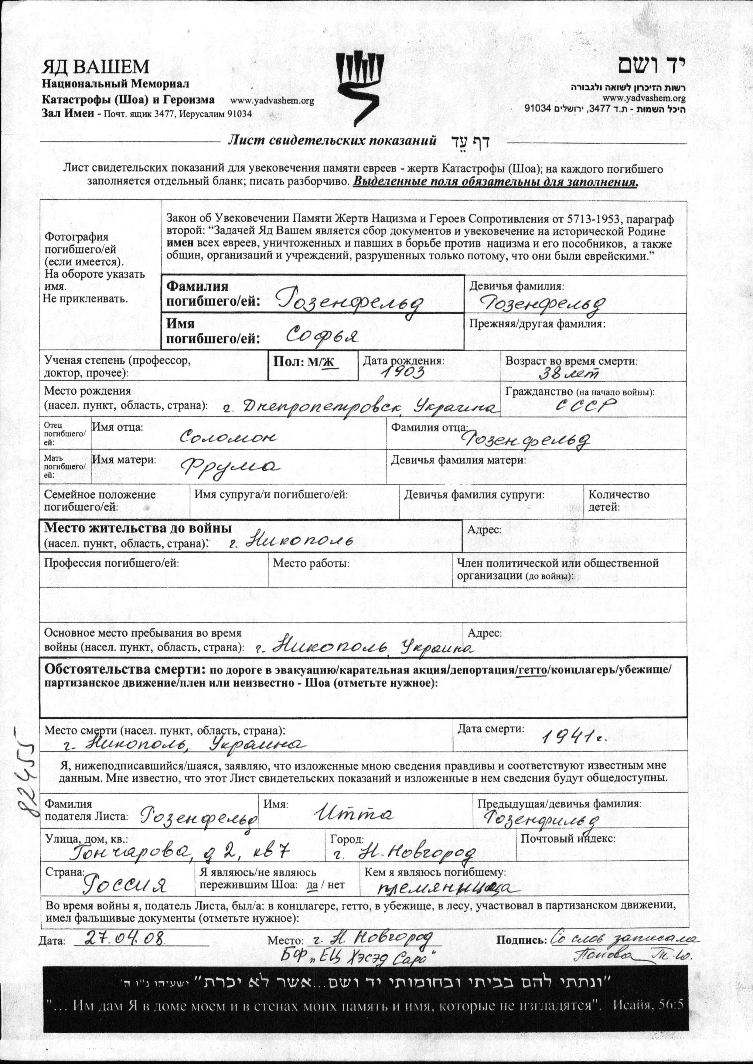 Розенфельд Софья 1903 Никопол, Украина (СССР) Лист свидетельских показаний