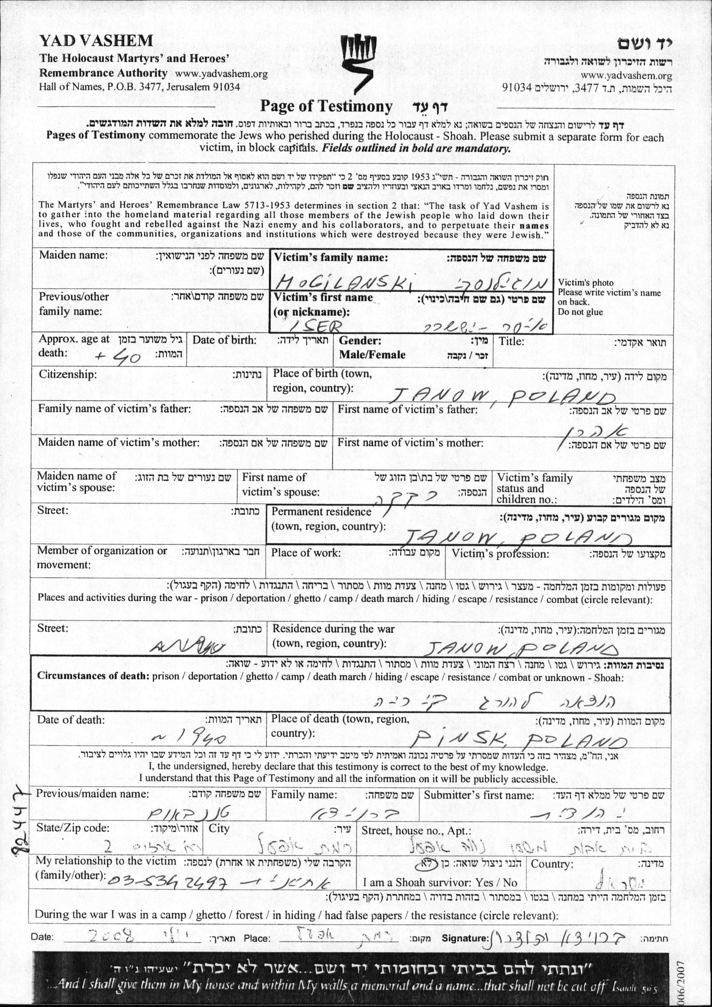 Исер Иссахар Могилянски, место рождения: Янов Полесский, Польша. Отец: Арон. Женат / замужем. Место жительства до войны: Янов Полесский, Польша. Место во время войны: Янов Полесский, Польша.