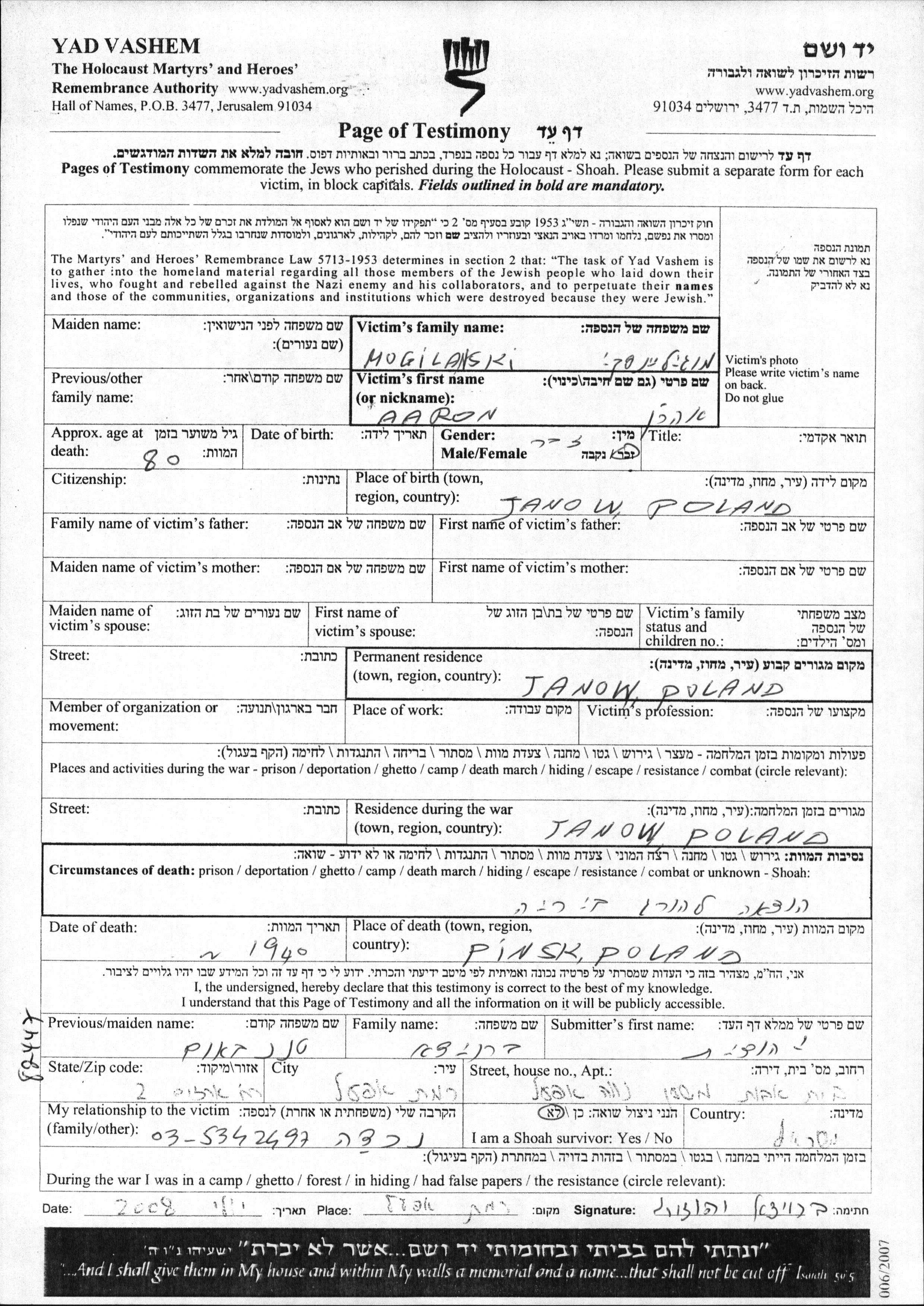Аарон Могилянски, место рождения: Янув, Польша. Женат / замужем. Место жительства до войны: Янув, Польша. Место во время войны: Янув, Польша.