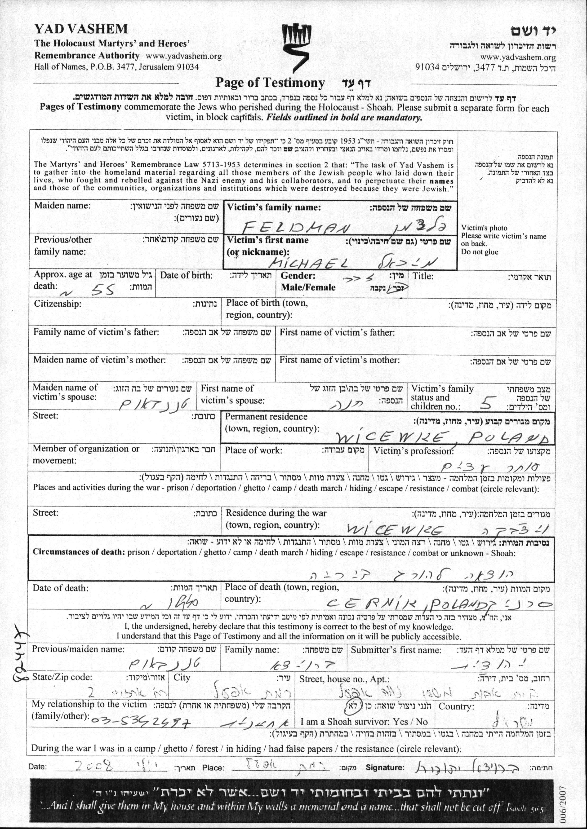 Михаэль Фельдман. Лесоторговец. Женат / замужем. Место жительства до войны: Вичувка, Польша. Место во время войны: Вичувка, Польша.