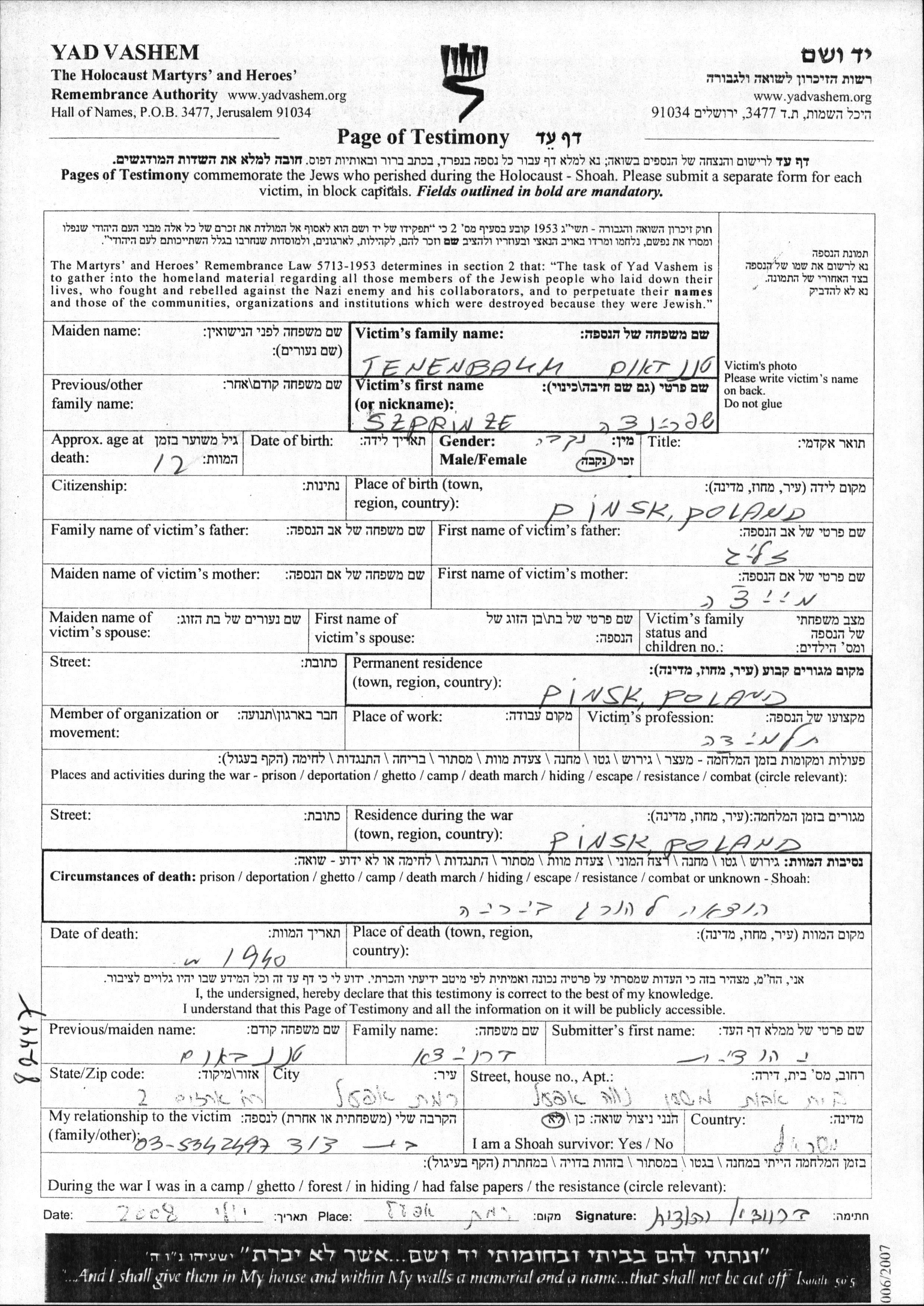Тененбаум Шпринце Пинск, Польша Лист свидетельских показаний