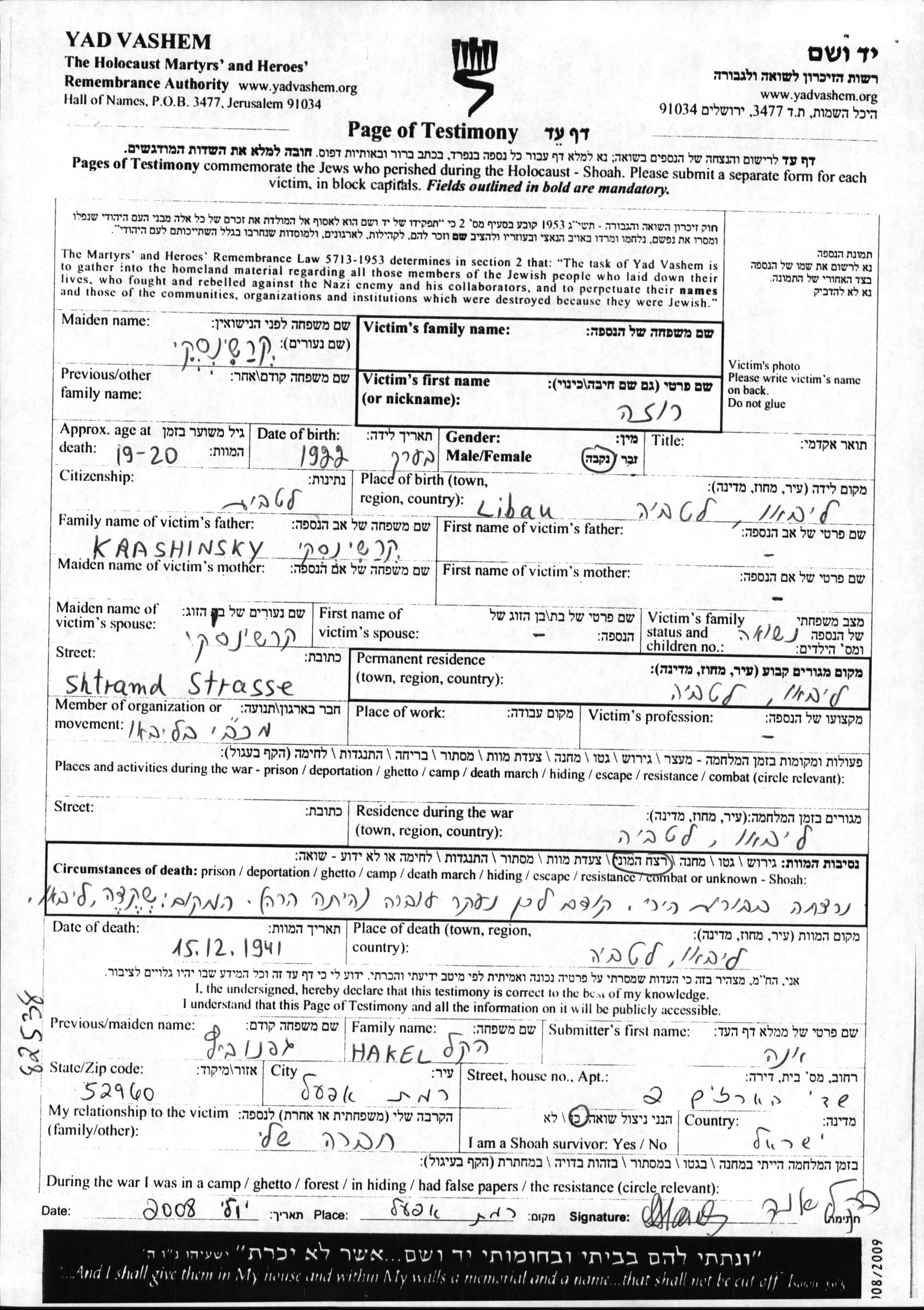 Яд Вашем - Листы свидетельских показаний Мемориального фонда