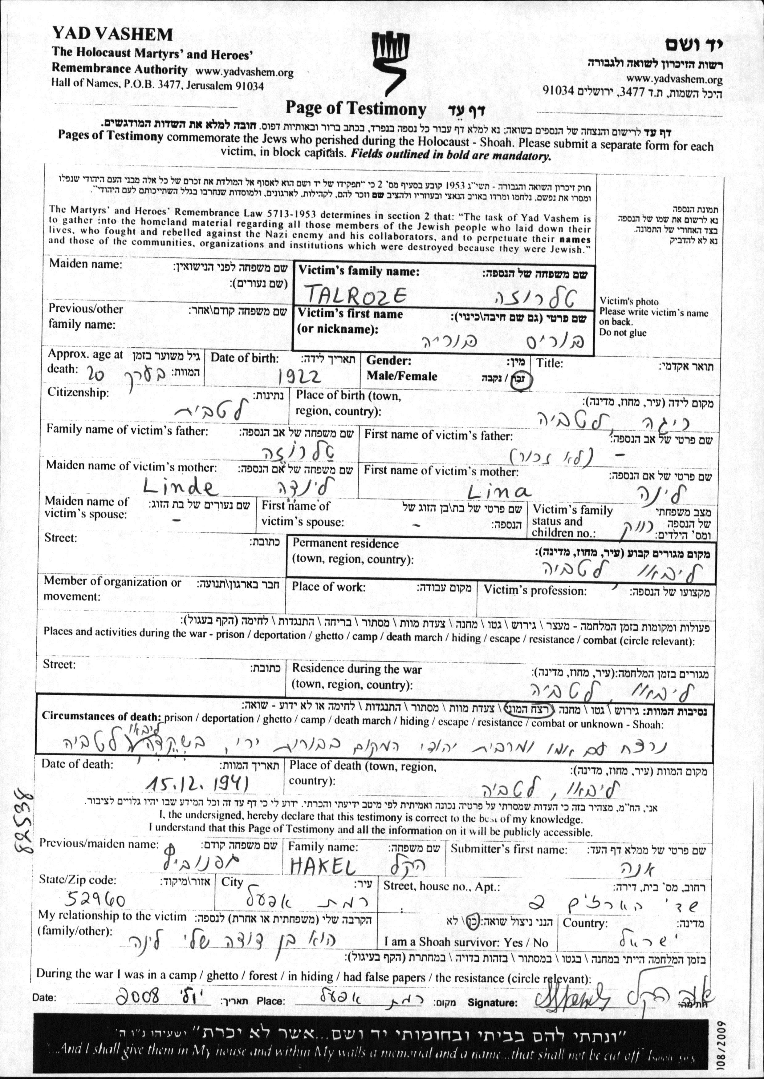 Яд Вашем - Листы свидетельских показаний Мемориального фонда