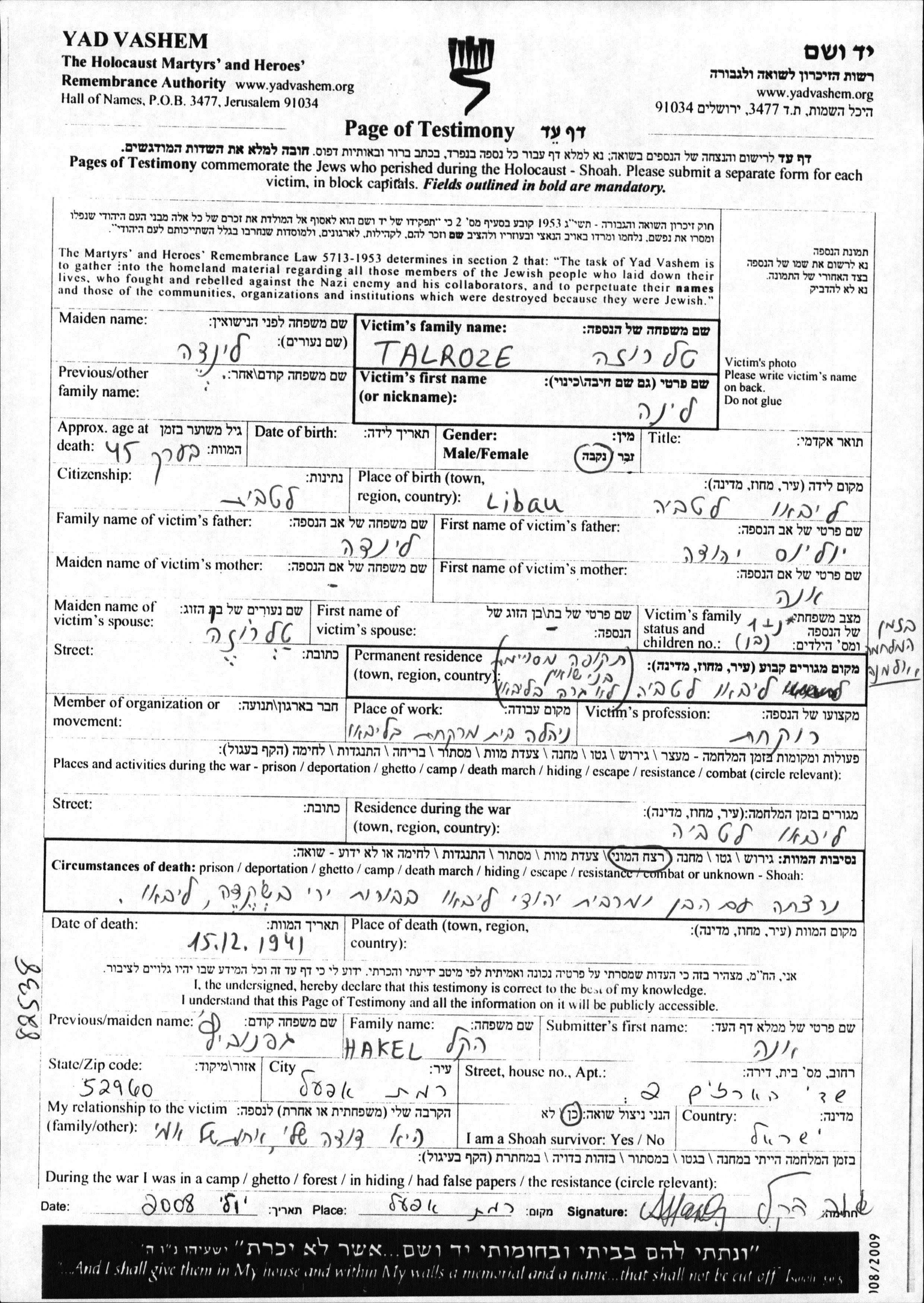 Яд Вашем - Листы свидетельских показаний Мемориального фонда