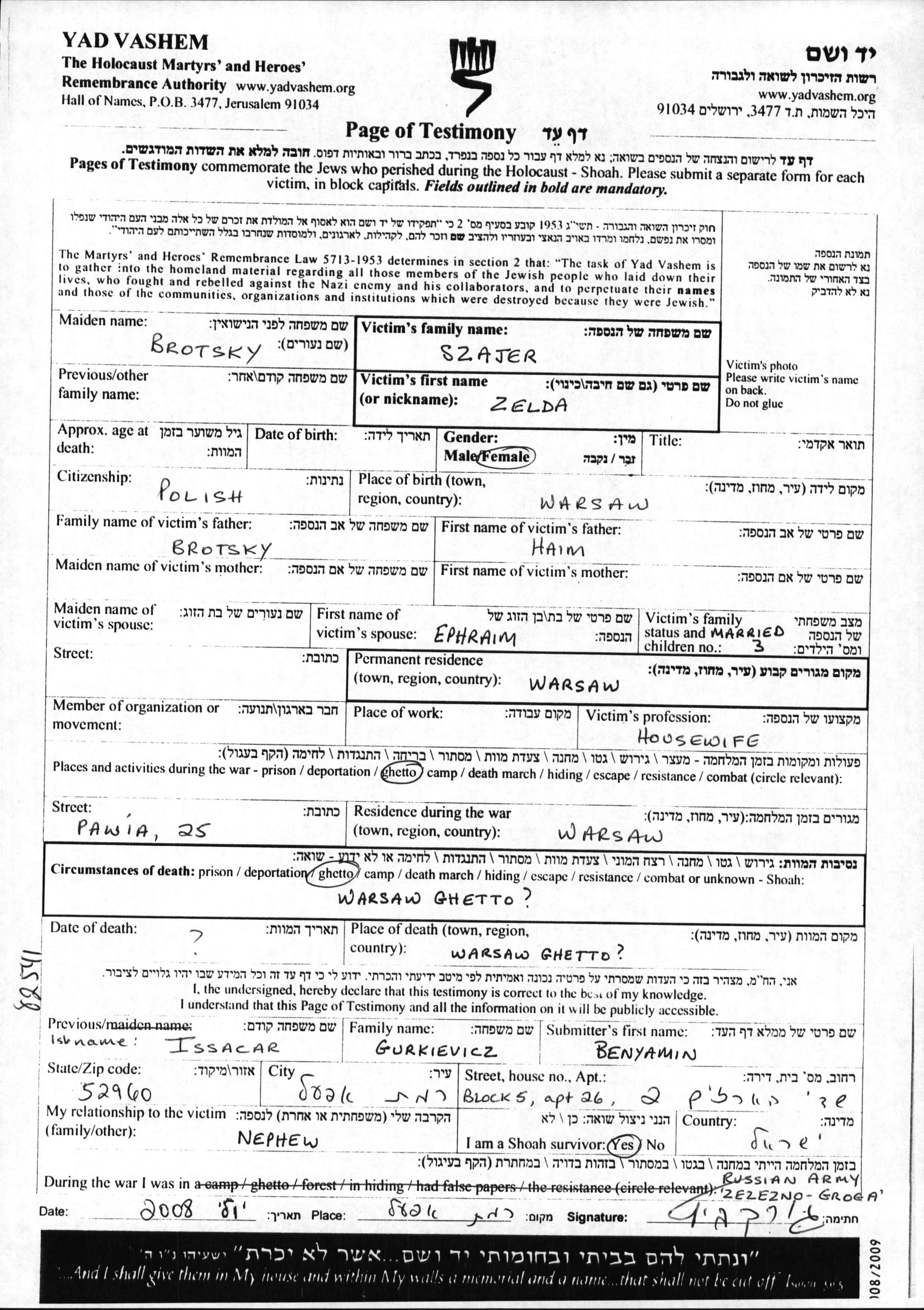Зельда Шайер, девичья фамилия Броцки, место рождения: Варшава, Польша. Отец: Хаим. Домохозяйка. Женат / замужем. Место жительства до войны: Варшава, Польша. Место во время войны: Варшава, Польша.
