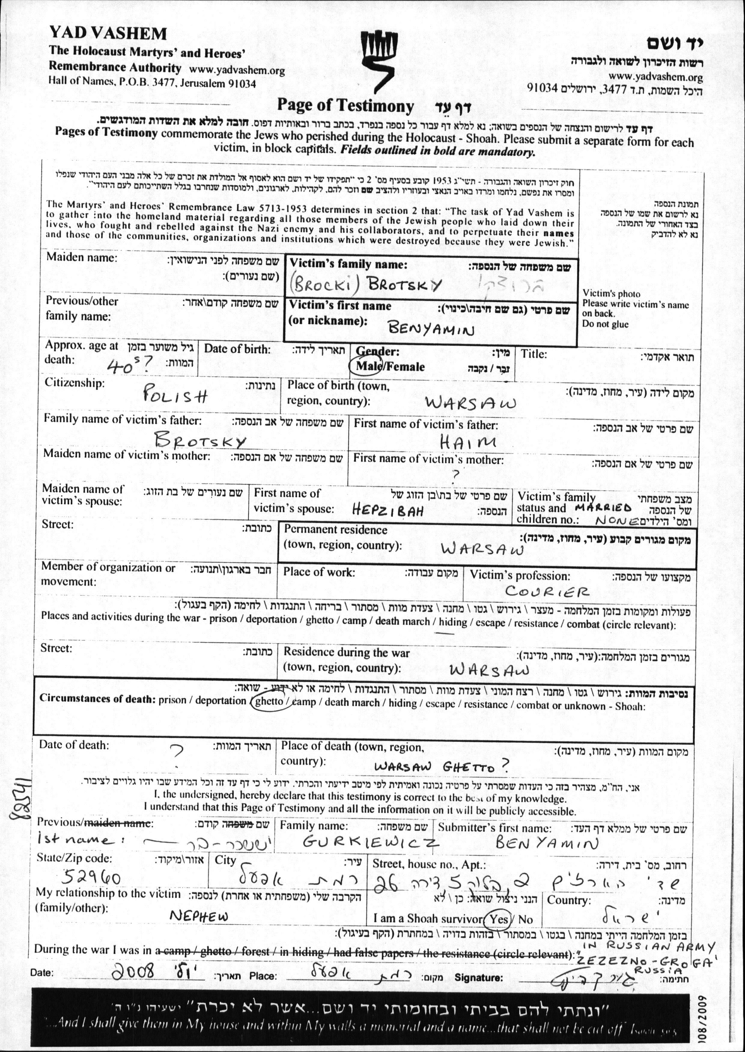 Беньямин Броцки, место рождения: Варшава, Польша. Отец: Хаим. Посыльный/ая. Женат / замужем. Место жительства до войны: Варшава, Польша. Место во время войны: Варшава, Польша.