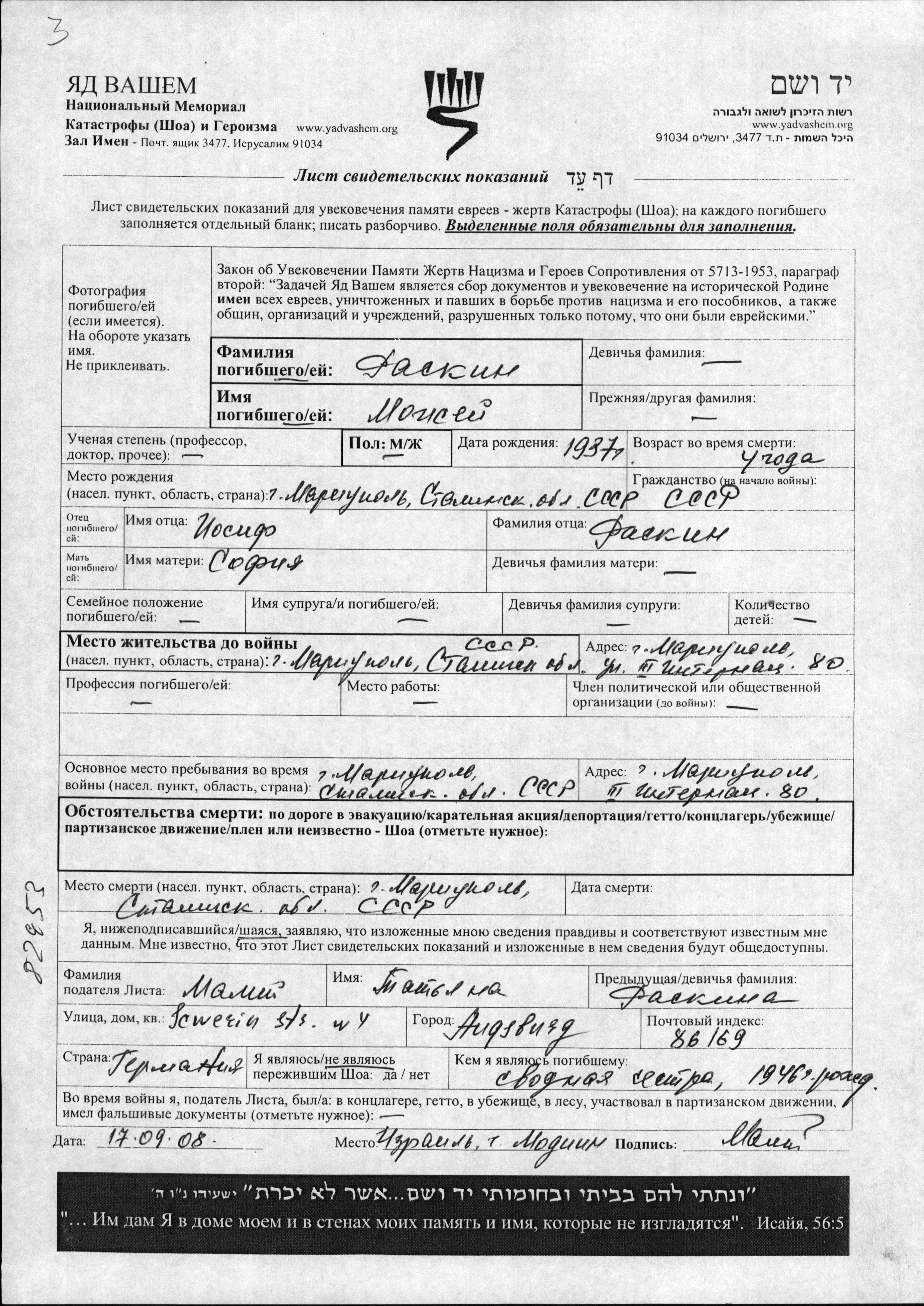 Раскин Маисей 1937 Мариуполь, Украина (СССР) Лист свидетельских показаний