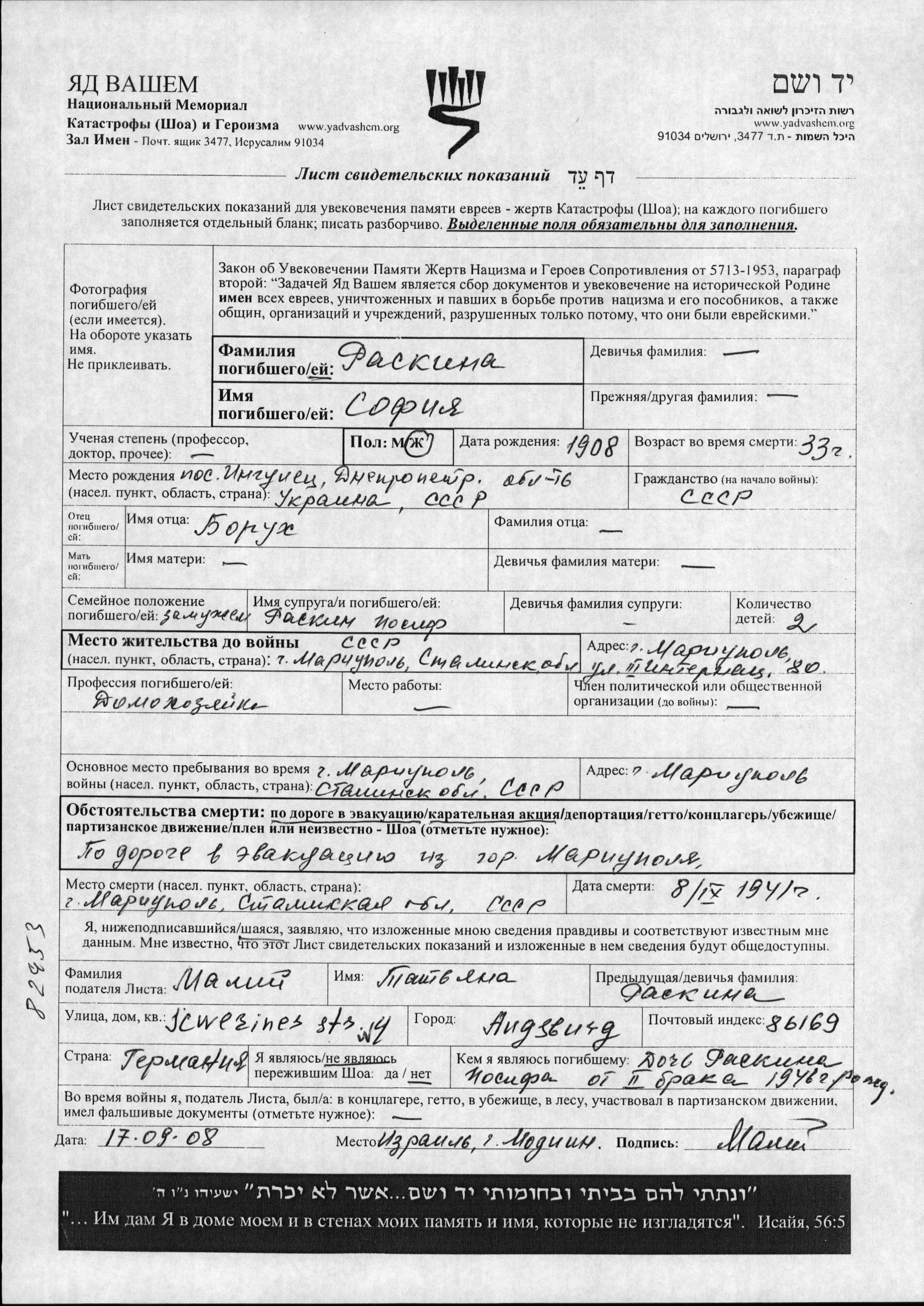 Раскина Софья 1908 Мариуполь, Украина (СССР) Лист свидетельских показаний