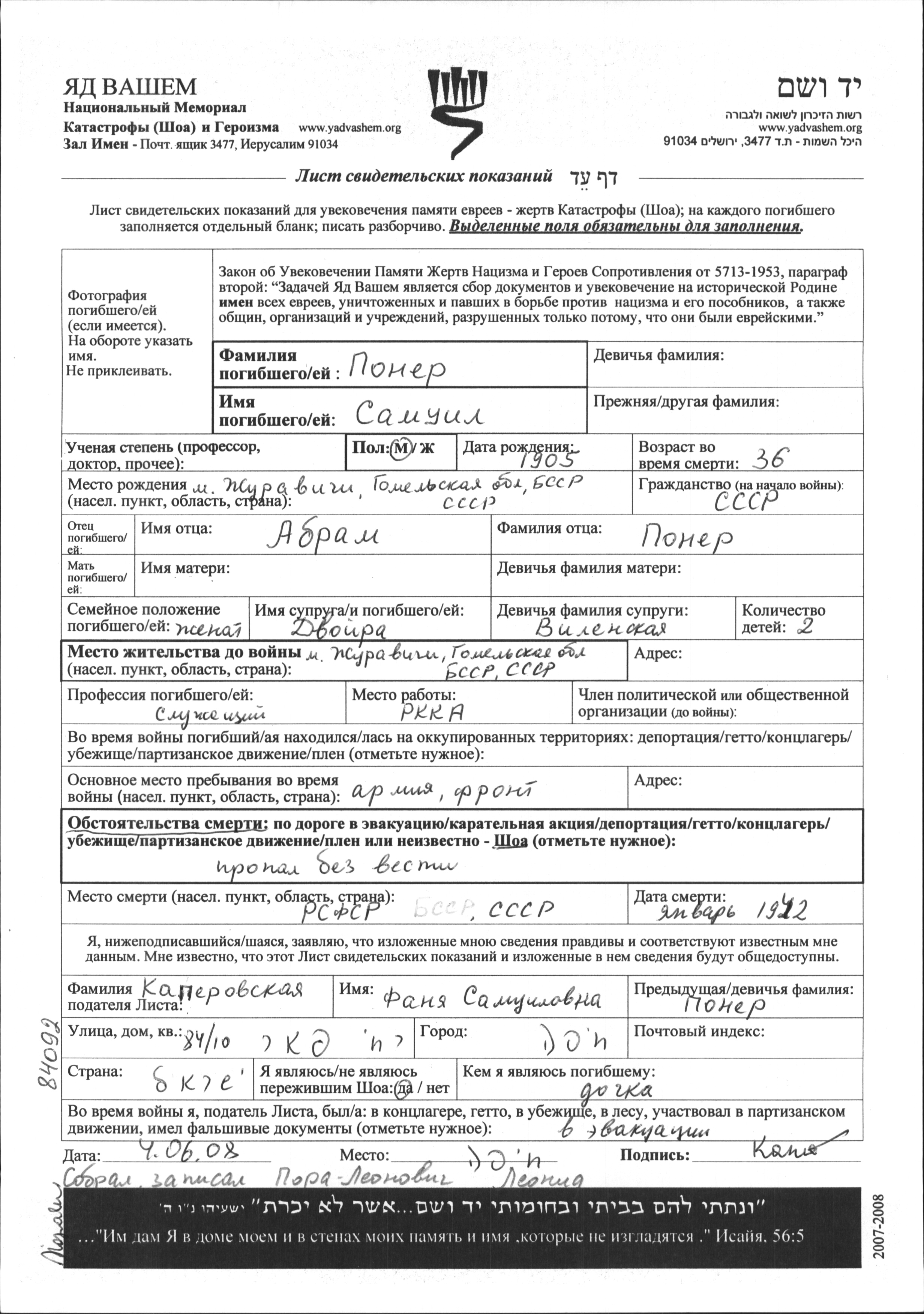 Понер Самуил 1905 Журавичи, Белоруссия (СССР) Лист свидетельских показаний