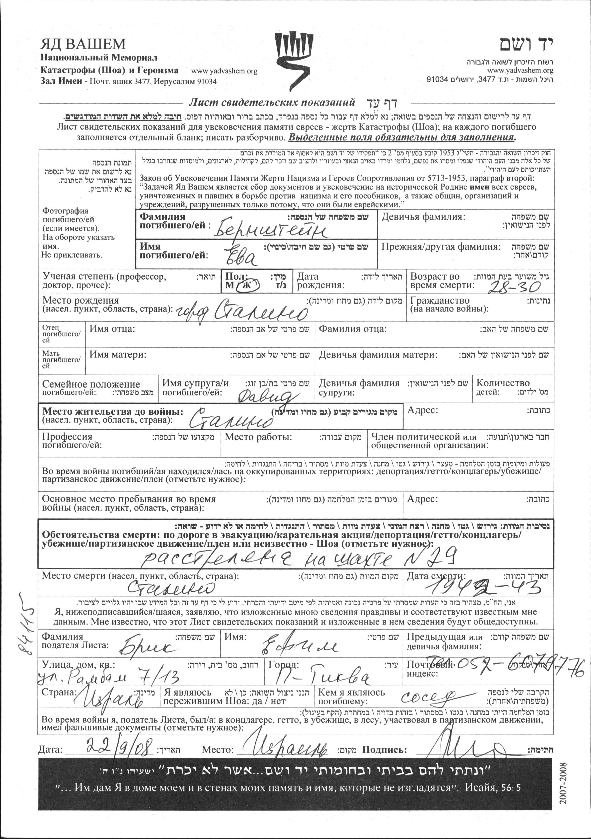 Бернштейн Ева Сталино, Украина (СССР) Лист свидетельских показаний