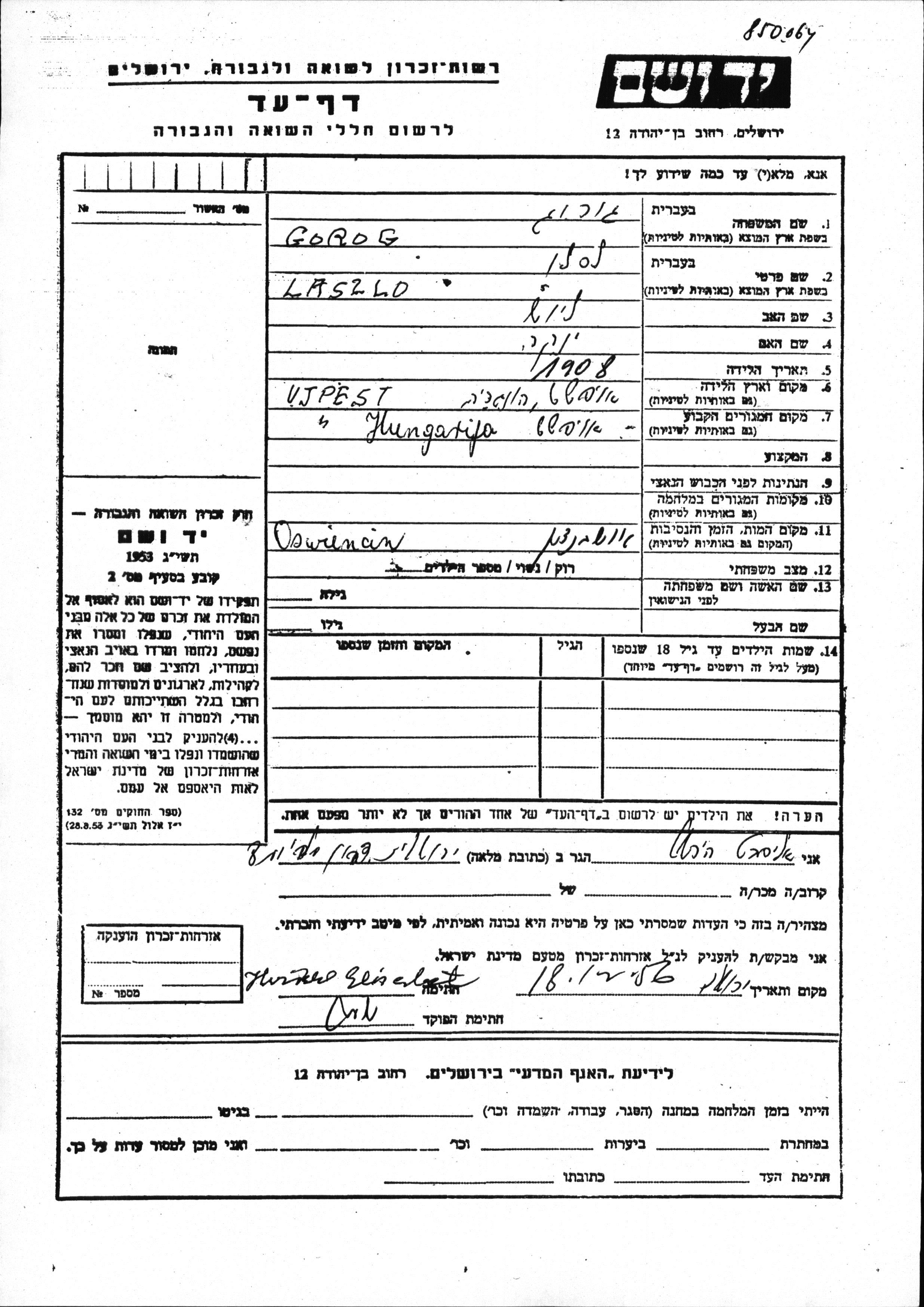 Ласло Горог, место рождения: Уйпешт, Венгрия. Отец: Лайош, mать:Янка. Женат / замужем. Место жительства до войны: Уйпешт, Венгрия. Место во время войны: Уйпешт, Венгрия.
