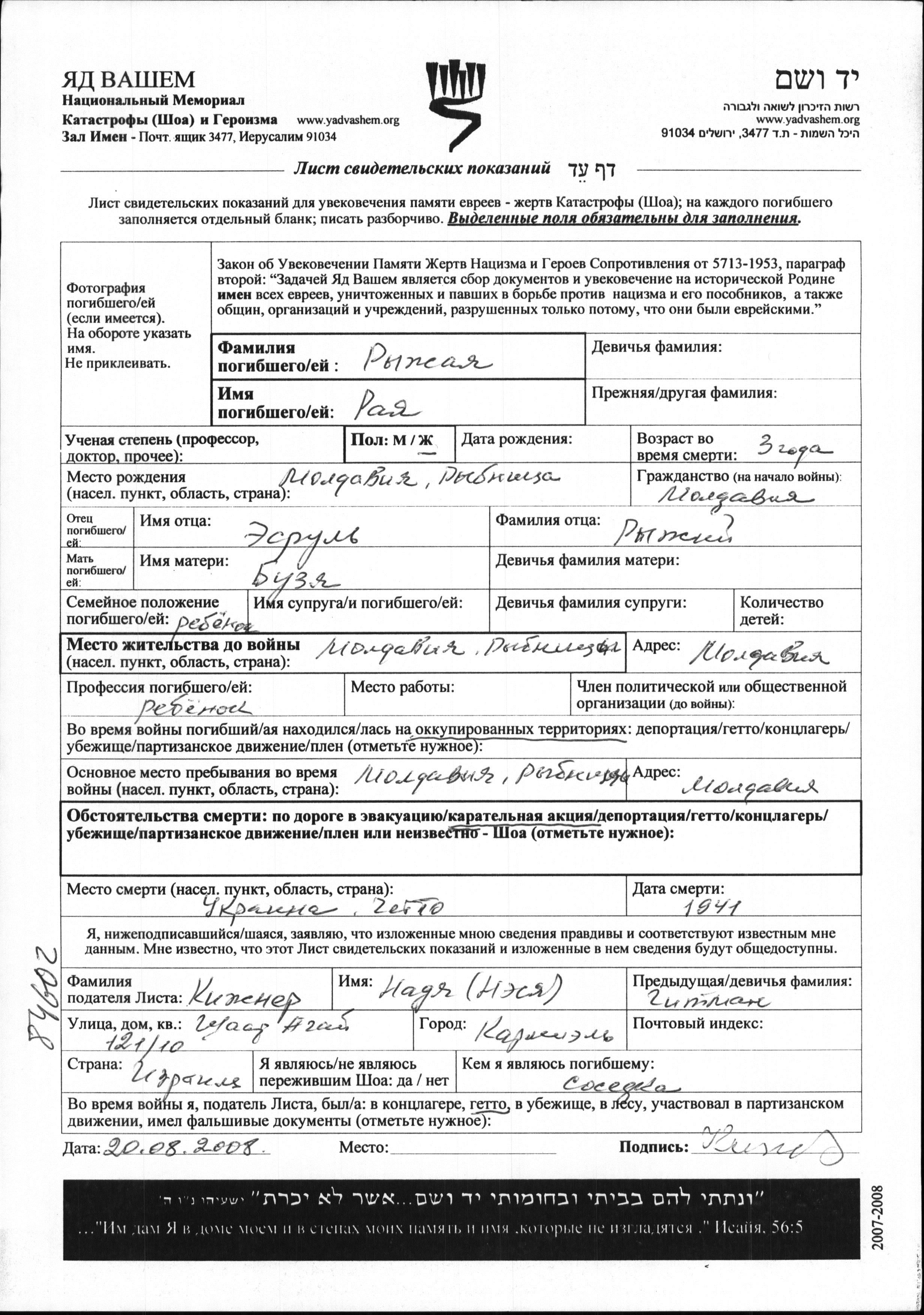 Яд Вашем - Листы свидетельских показаний Мемориального фонда