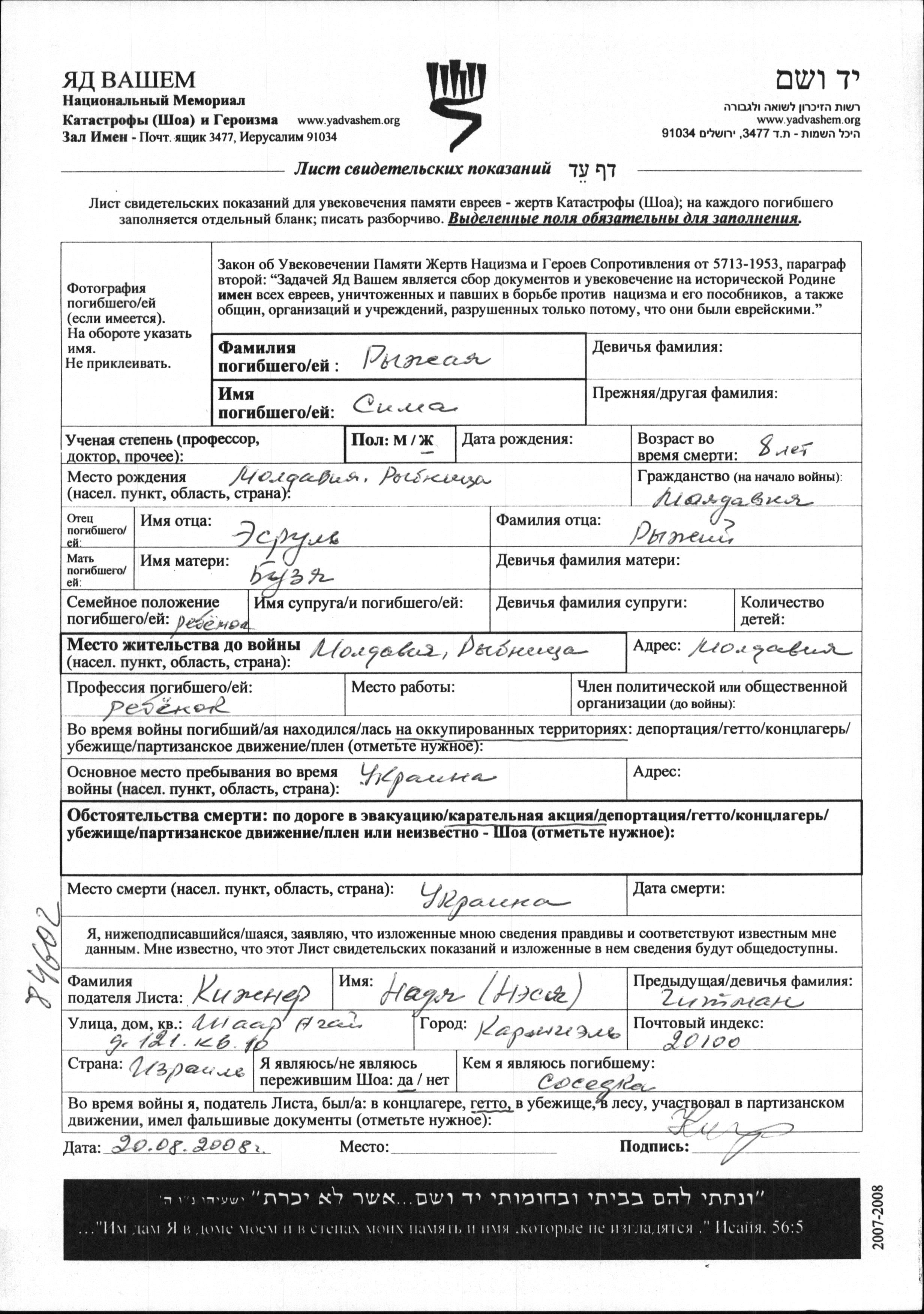 Рыжая Сима Рыбница, Украина (СССР) Лист свидетельских показаний
