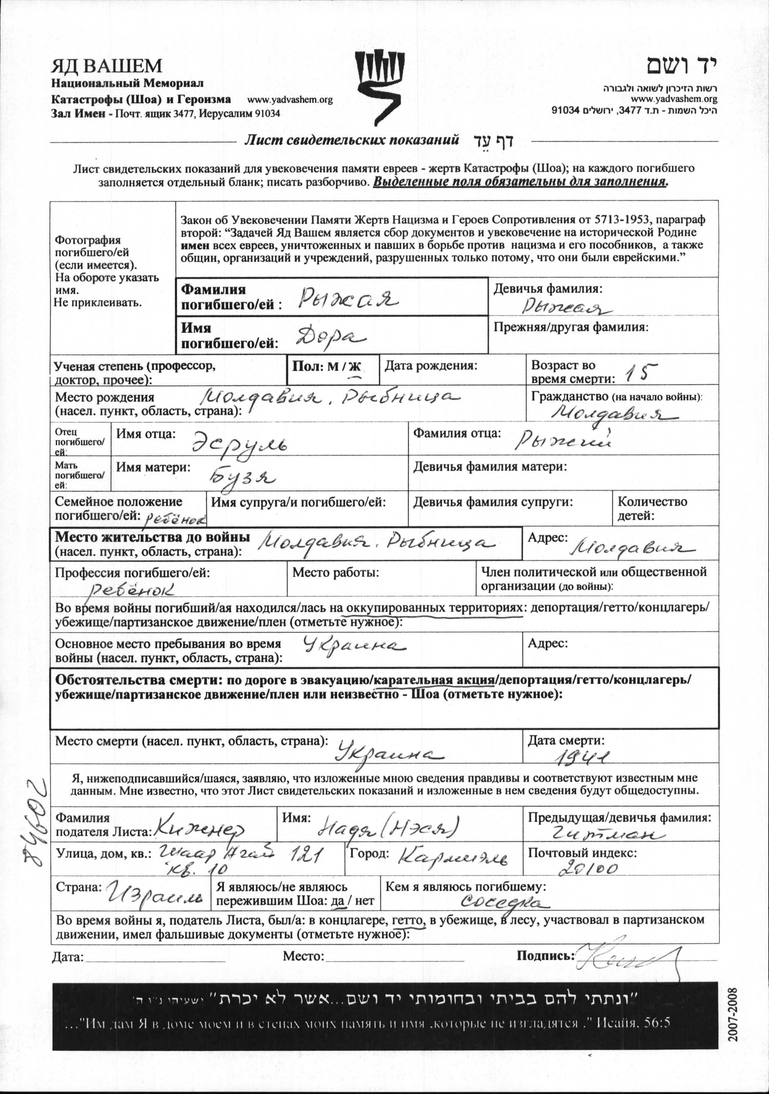 Рыжая Дора Рыбница, Украина (СССР) Лист свидетельских показаний