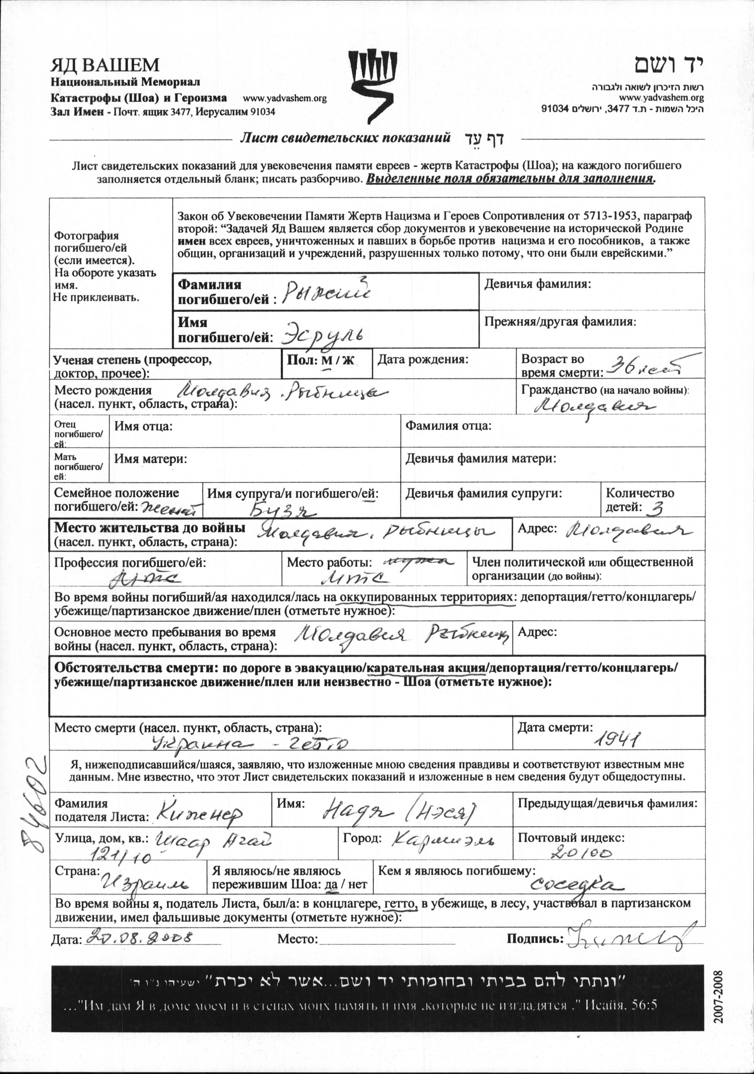 Рыжий Эсруль Рыбница, Украина (СССР) Лист свидетельских показаний