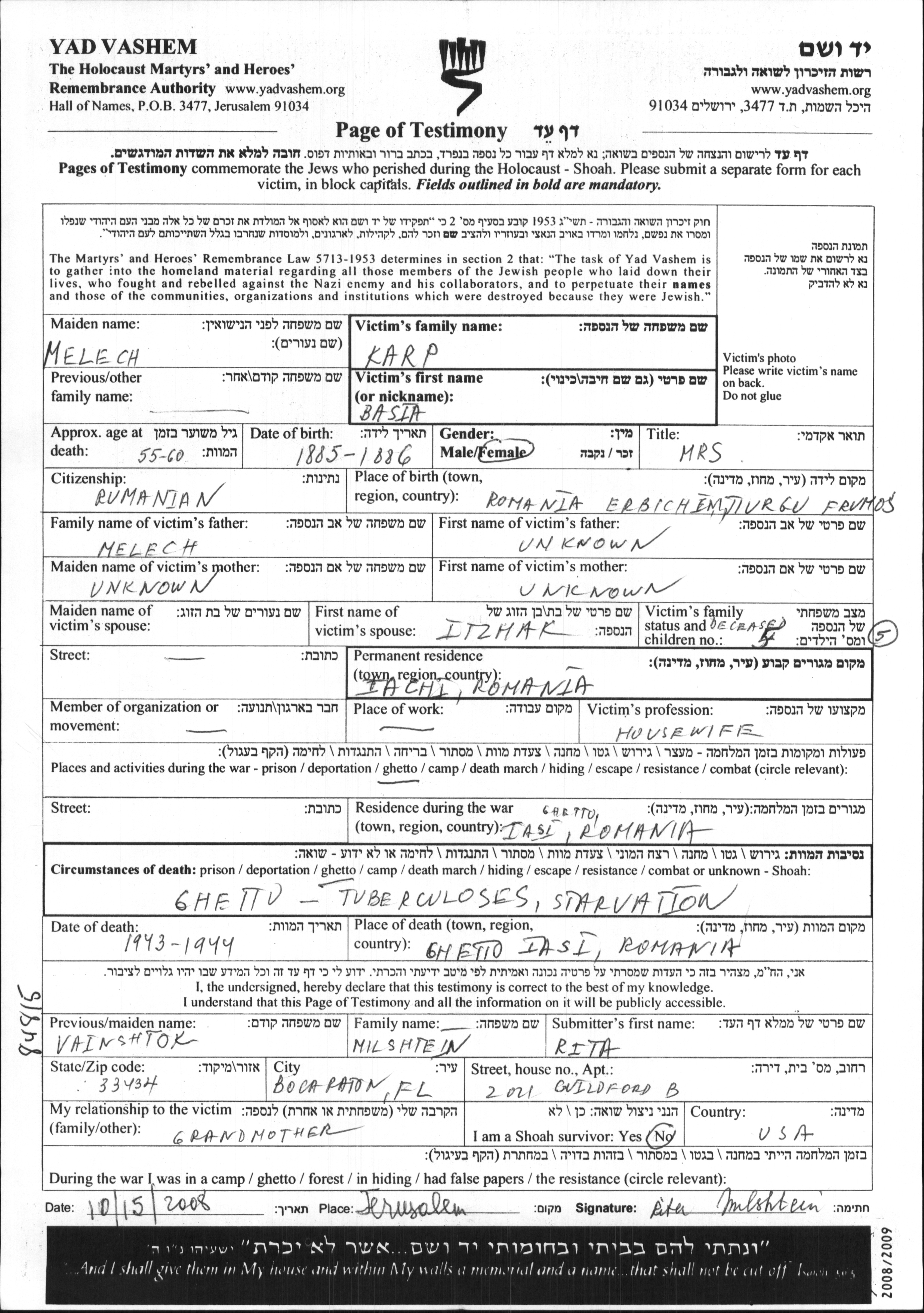 Бася Карп, девичья фамилия Мелех, место рождения: Тыргу-Фрумос, Румыния. Домохозяйка. Женат / замужем. Место жительства до войны: Яссы, Румыния. Место во время войны: ГЕТТО.