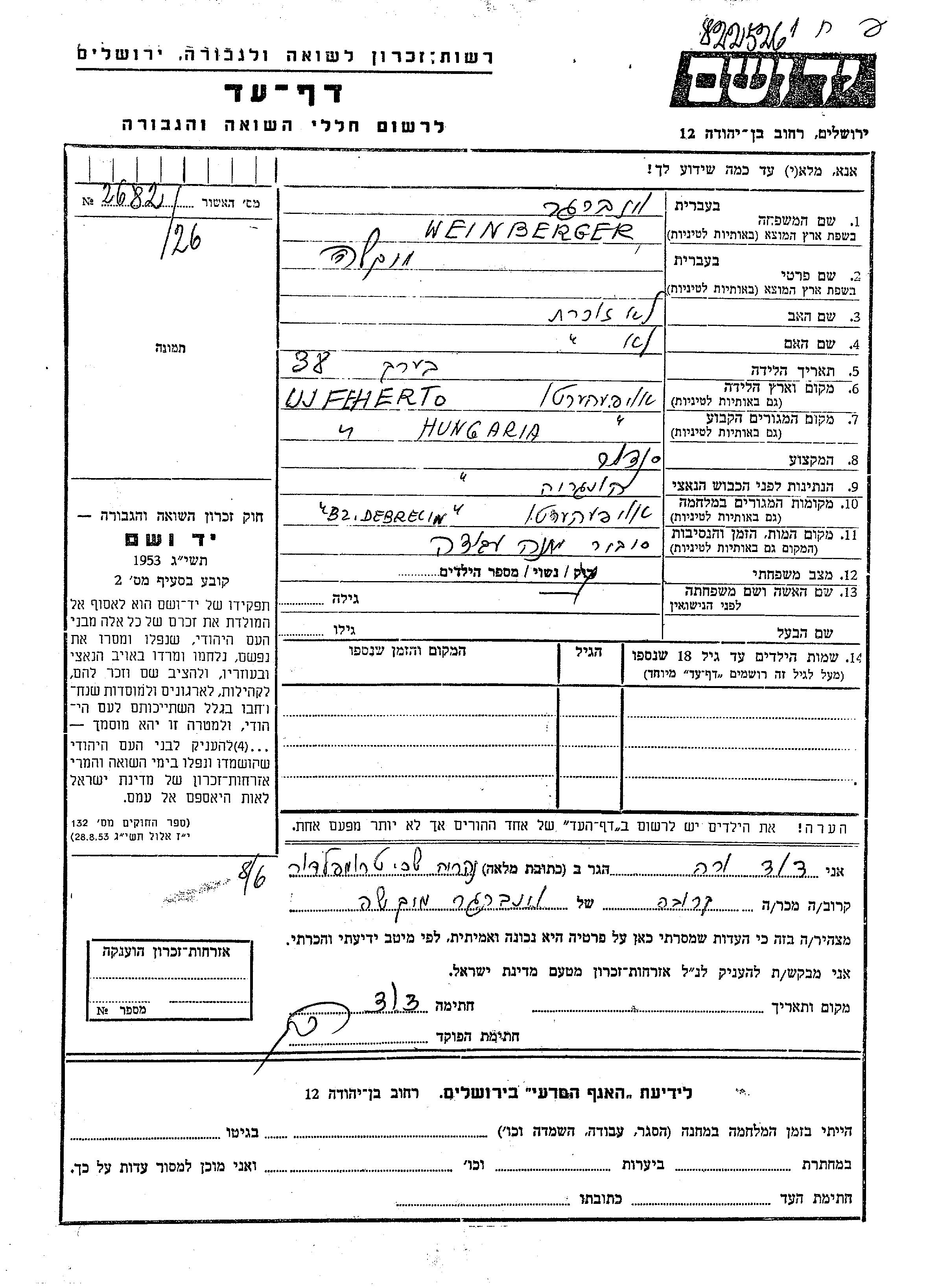 Микша Вейнбергер, место рождения: Уйфехерто, Венгрия. Сапожник. Женат / замужем. Место жительства до войны: Уйфехерто, Венгрия. Место во время войны: Уйфехерто, Венгрия.