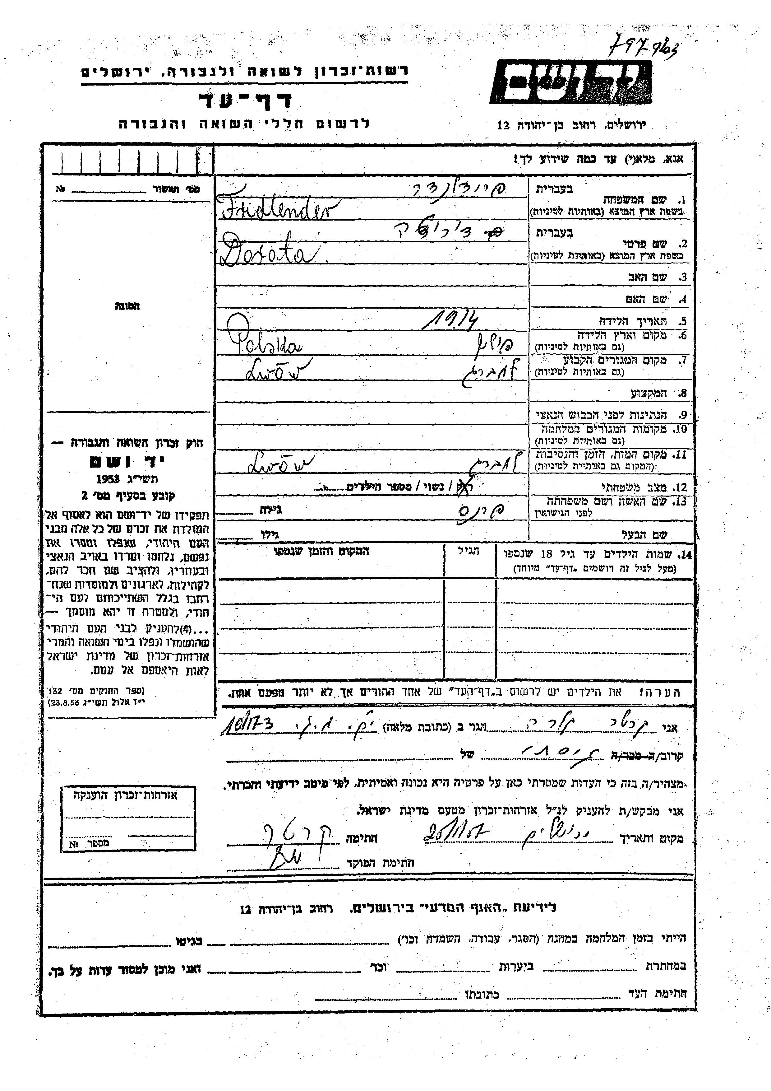 Дорота Фридлендер, девичья фамилия Парнес, место рождения: Польша. Женат / замужем. Место жительства до войны: Львов, Польша.