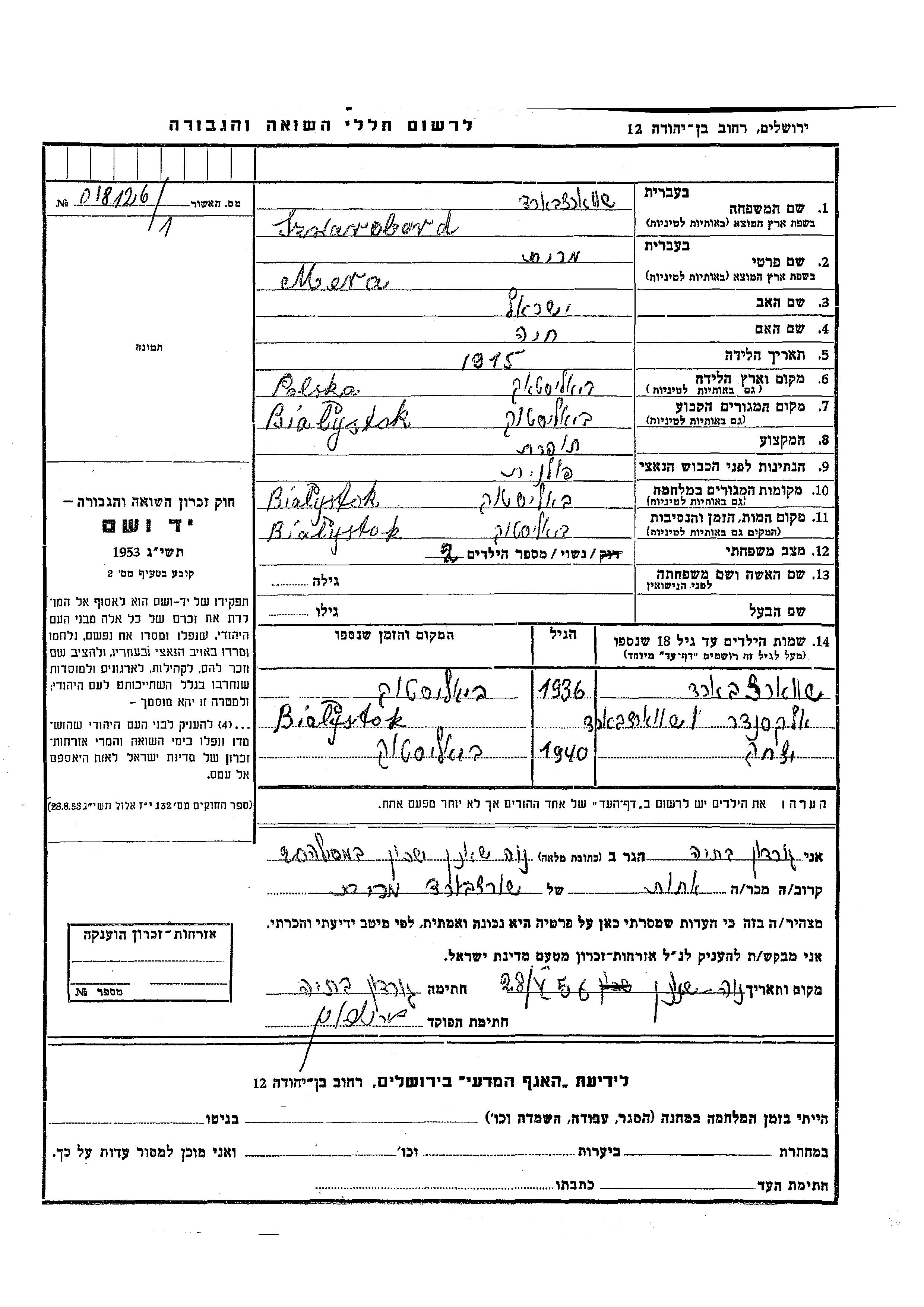 Мера Шварцбард, место рождения: Белосток, Польша. Отец: Исраэль, mать:Хая. Швея. Женат / замужем. Место жительства до войны: Белосток, Польша. Место во время войны: Белосток, Польша.
