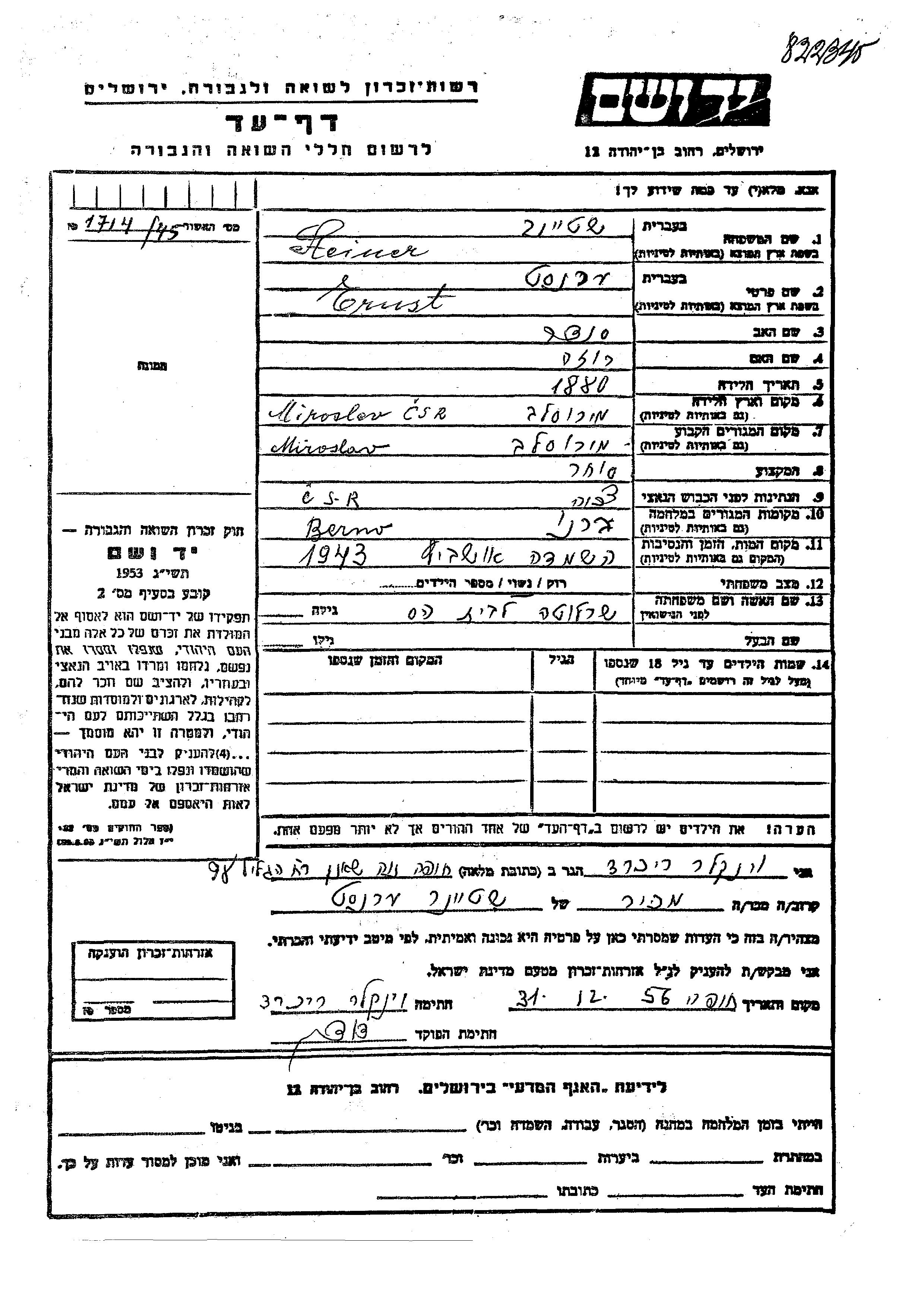 Эрнст Штайнер, место рождения: Мирослав, Чехословакия. Отец: Сандор, mать:Роза. Торговец / торговка. Женат / замужем. Место жительства до войны: Мельник, Чехословакия. Место во время войны: Брно, Чехословакия.