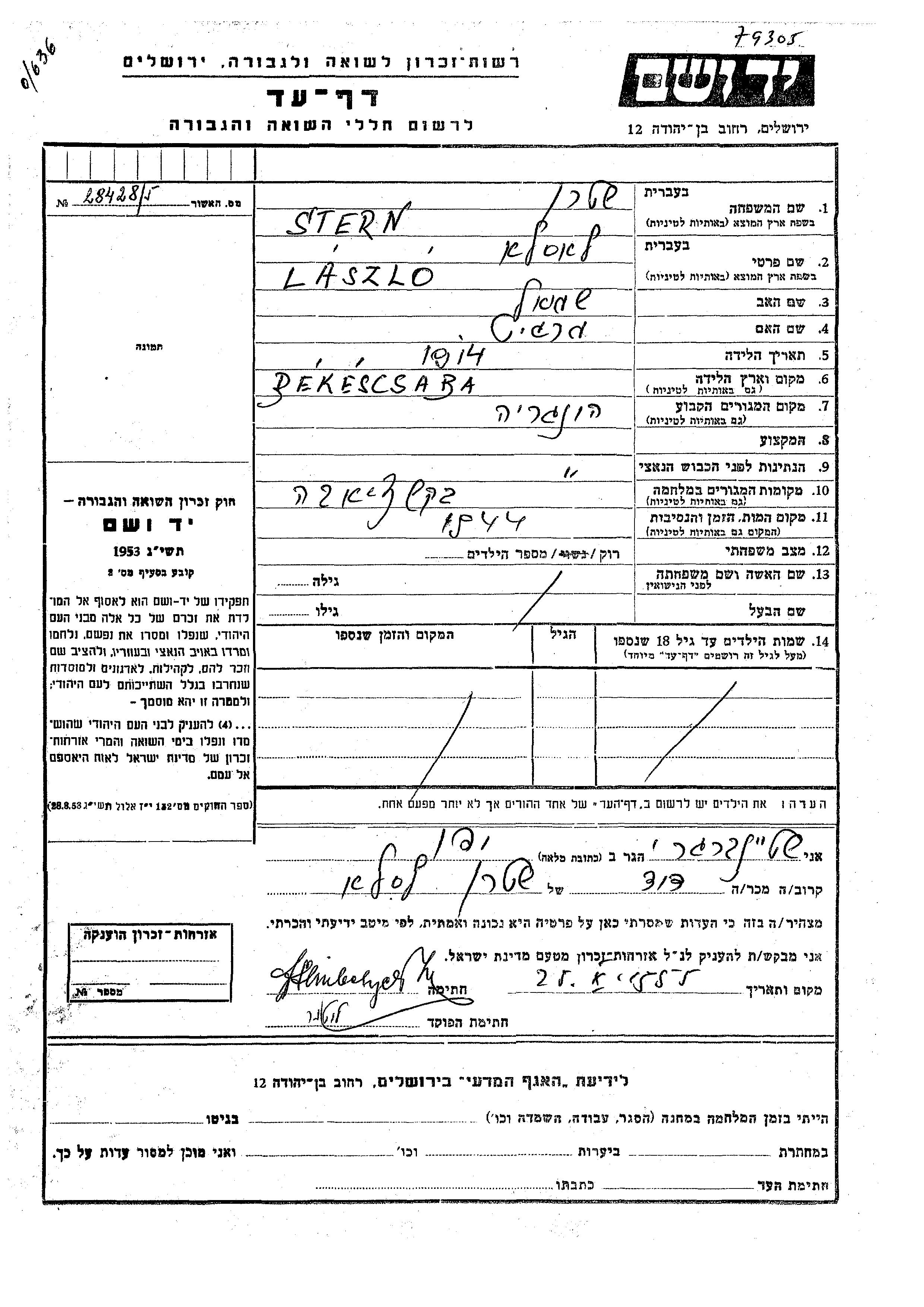 Ласло Штерн, место рождения: Бекешчаба, Венгрия. Отец: Шмуэль, mать:Маргарит. Холост / не замужем. Место жительства до войны: Венгрия. Место во время войны: Бекешчаба, Венгрия.