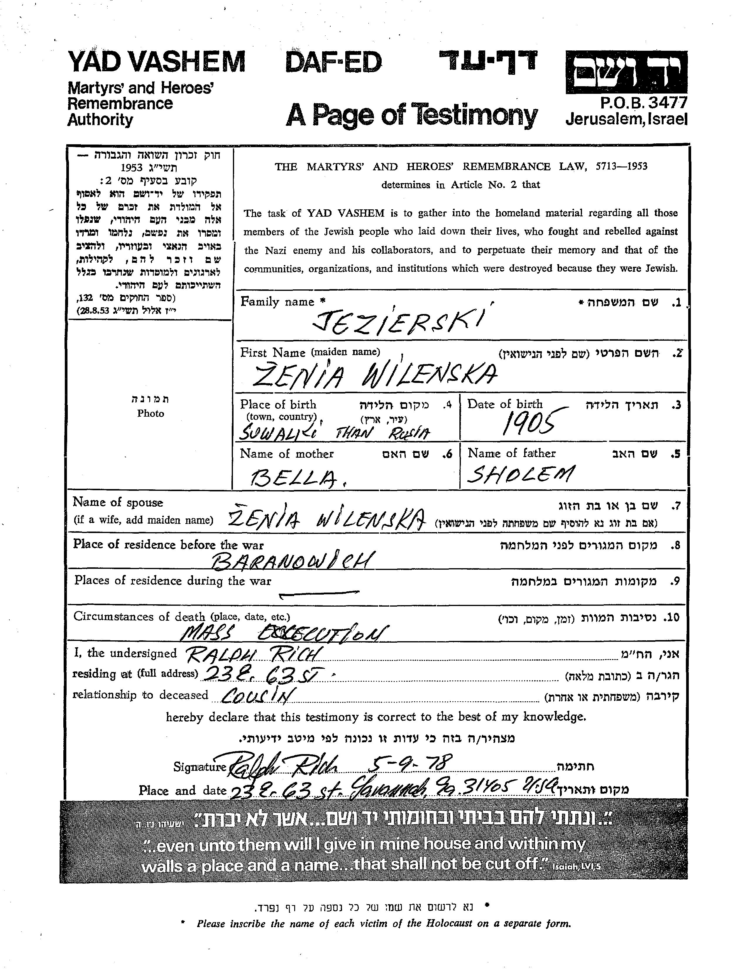 Женя Езирски, девичья фамилия Виленска, место рождения: Сувалки, Польша. Отец: Шулем, mать:Белла. Место жительства до войны: Барановичи, Польша.