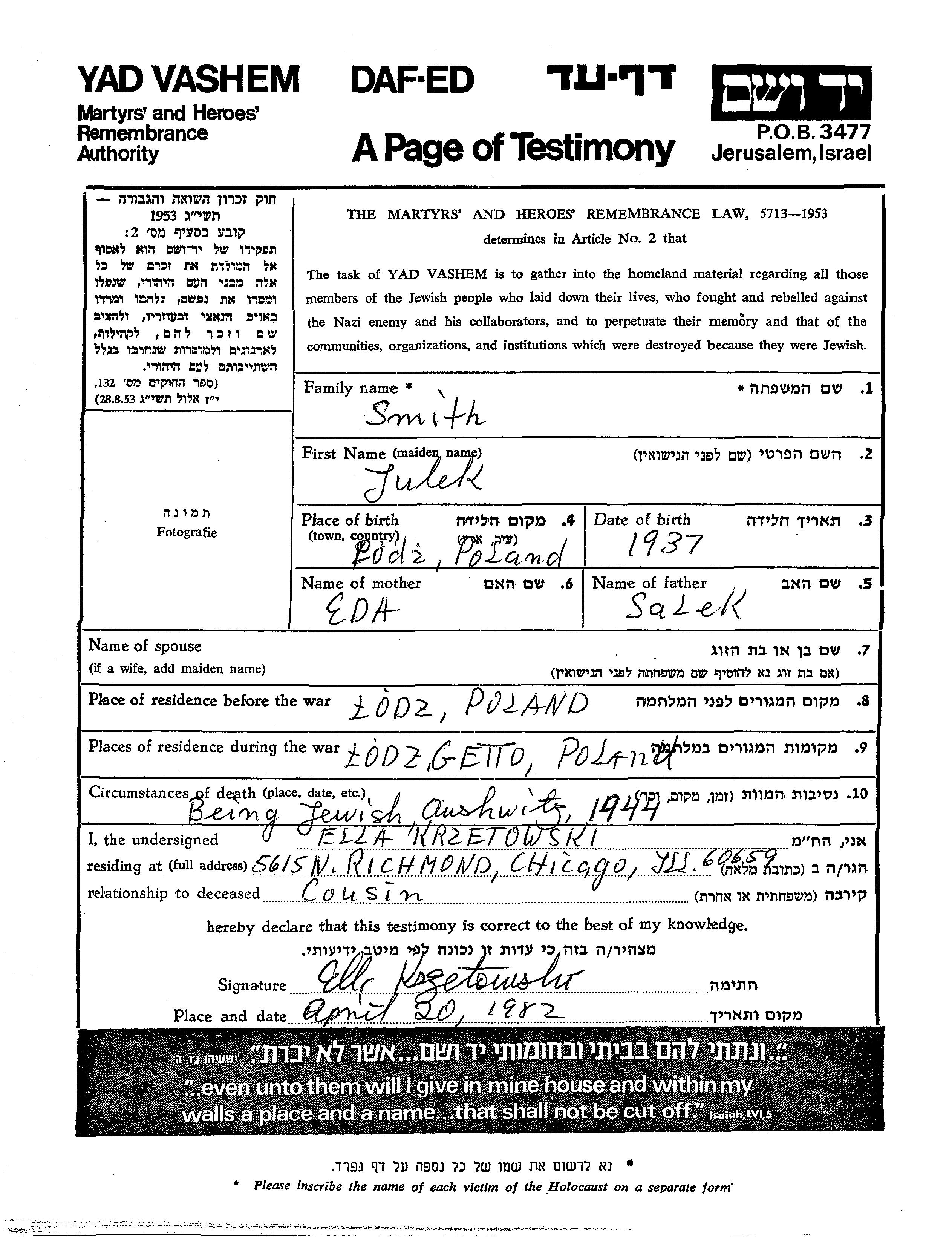 Смит Юлик 1937 Лодзь, Польша Лист свидетельских показаний
