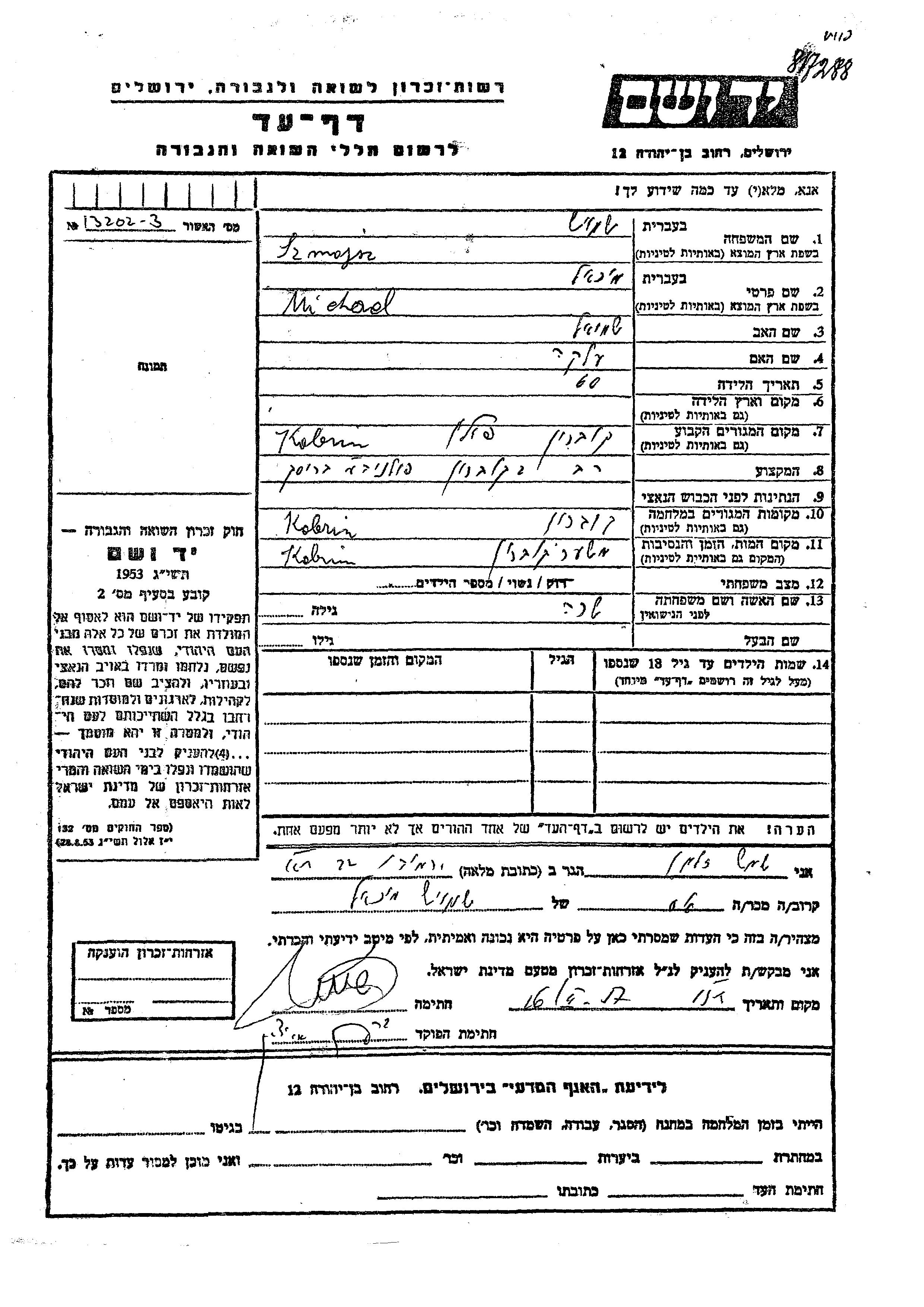 Михаэль Шмойш Шмуэль Элка. Раввин. Женат / замужем. Место жительства до войны: Кобрынь, Польша. Место во время войны: Кобрин, Польша.