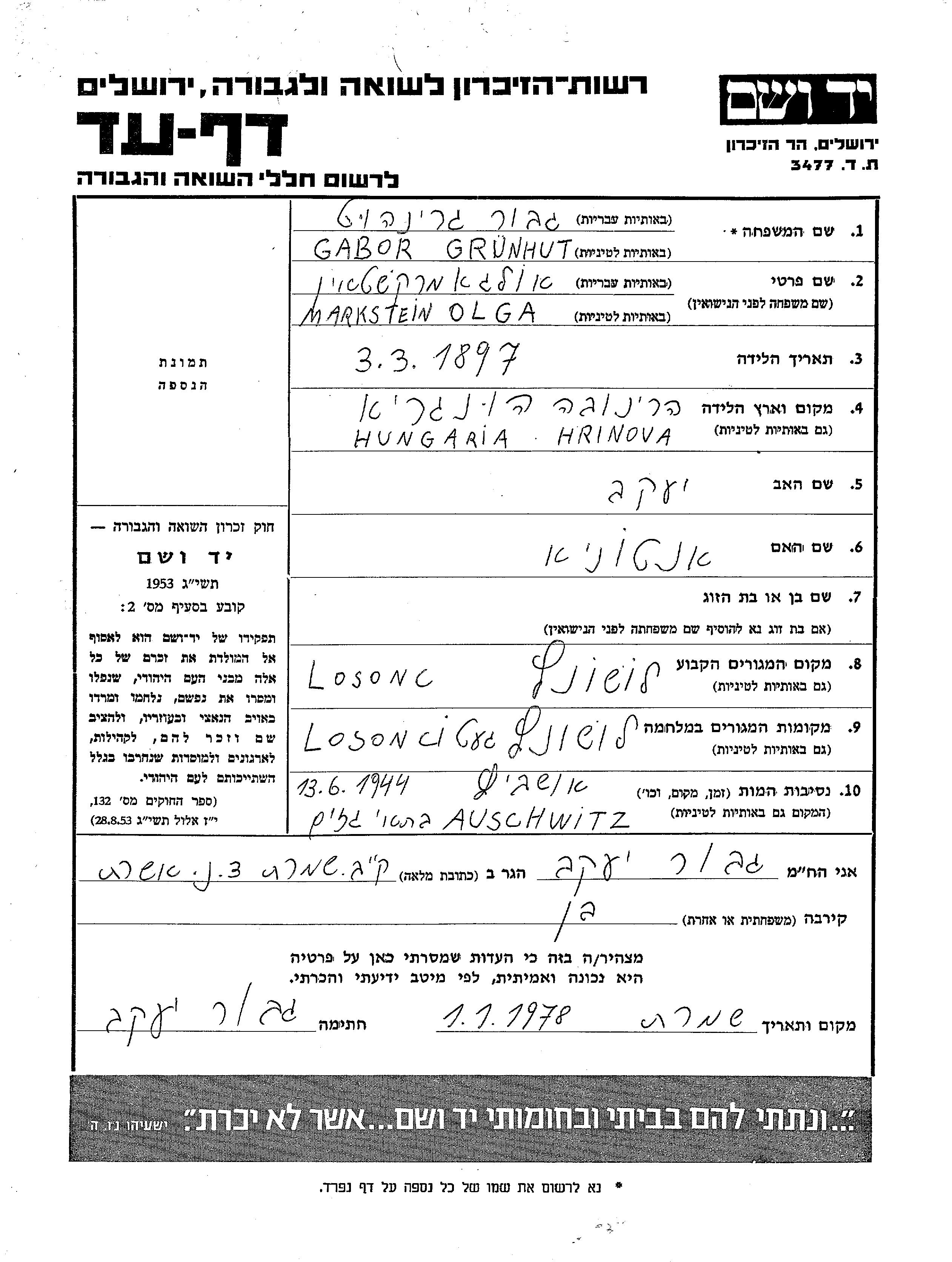 Ольга Грунхут Габор, девичья фамилия Маркштейн, место рождения: Лошонц, Чехословакия. Отец: Яков, mать:Антония. Место жительства до войны: Лошонц, Чехословакия. Место во время войны: Аушвиц, Польша.