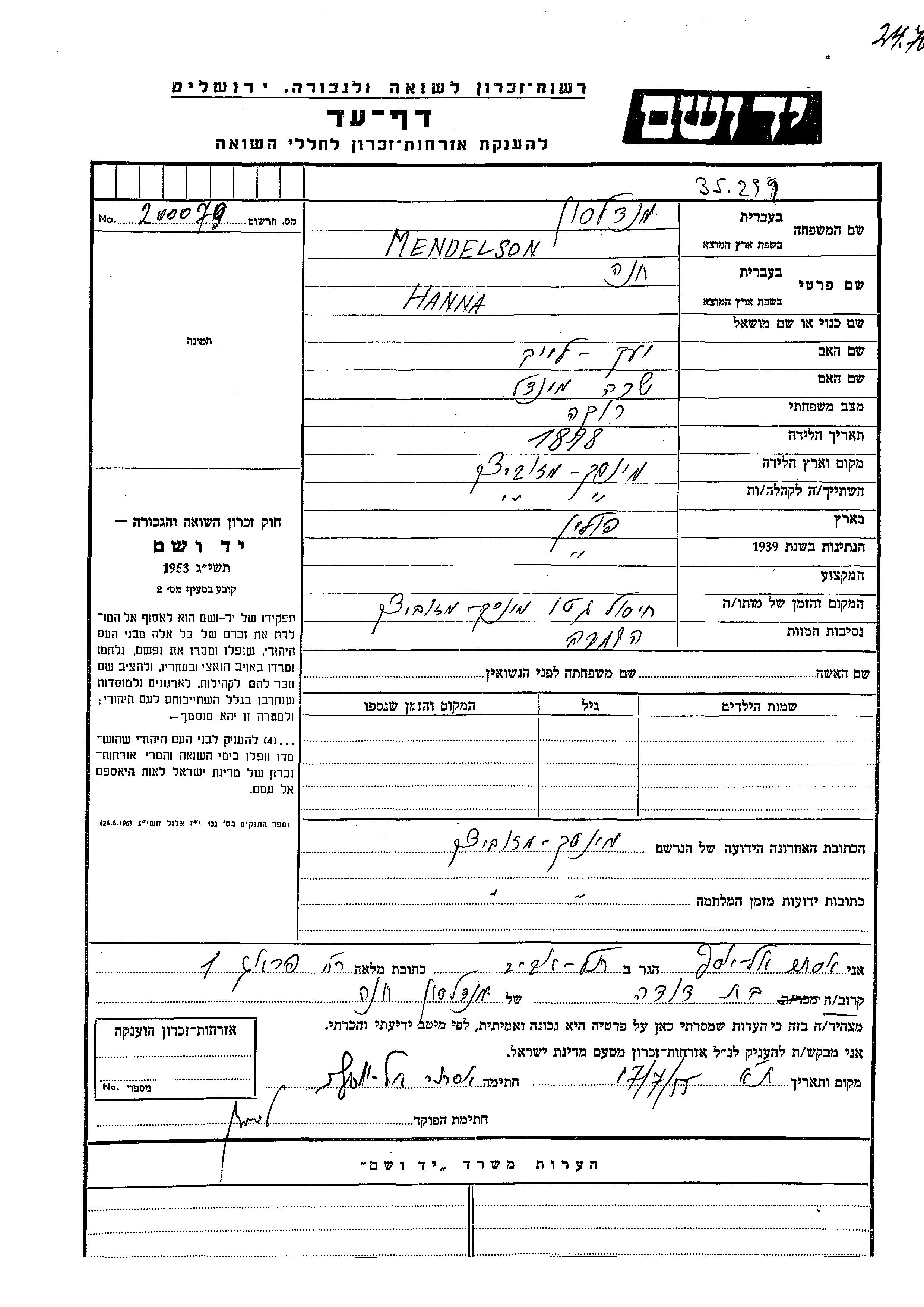 Ханна Мендельсон, место рождения: Миньск-Мазовецки, Польша. Отец: Як Лейб, mать:Сара Миндель. Холост / не замужем. Место жительства до войны: Польша. Место во время войны: Миньск-Мазовецки, Польша.