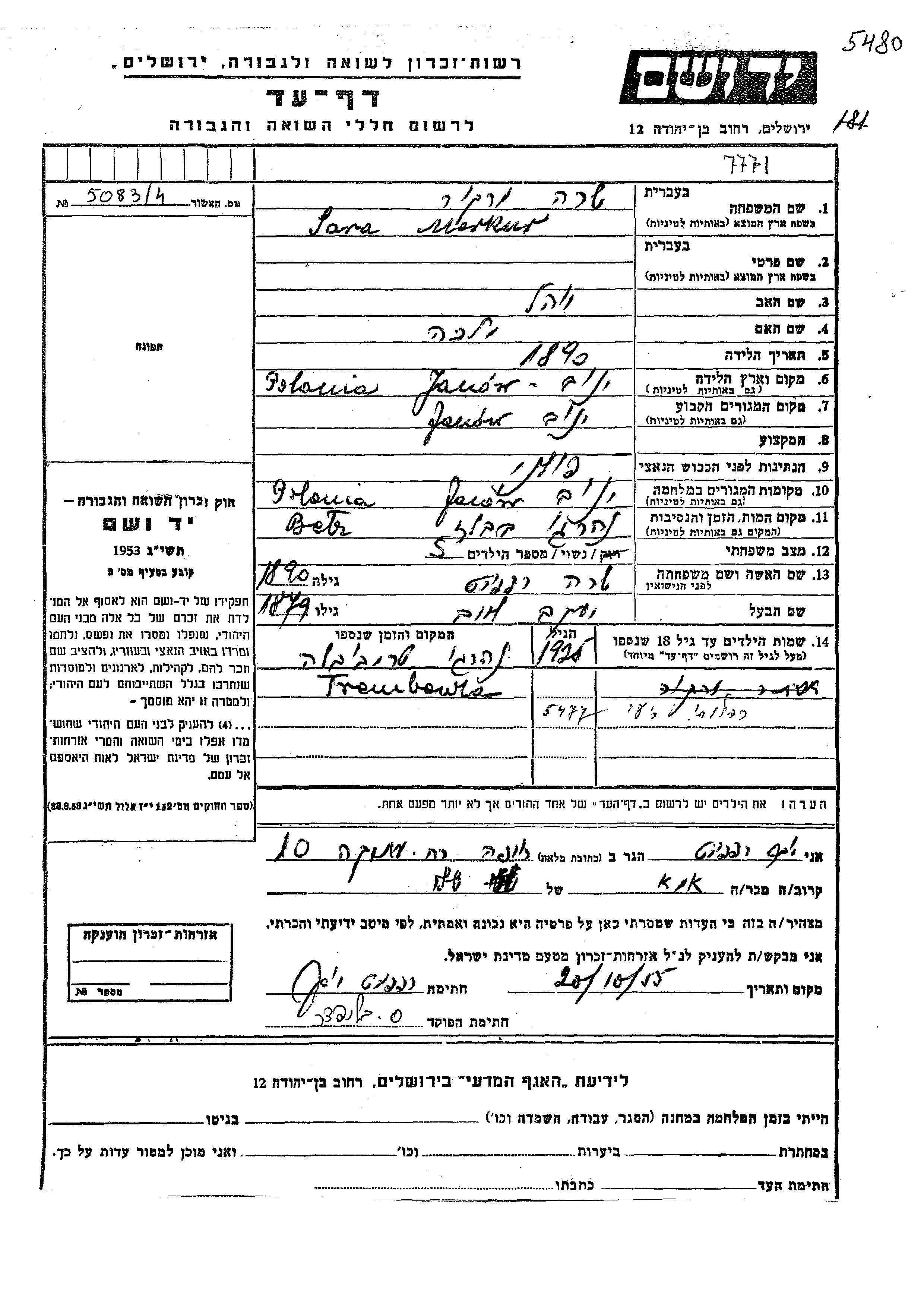 Сара Маркур, девичья фамилия Рапапорт, место рождения: Янув, Польша. Отец: Йоэль, mать:Малка. Женат / замужем. Место жительства до войны: Янув, Польша. Место во время войны: Янув, Польша.