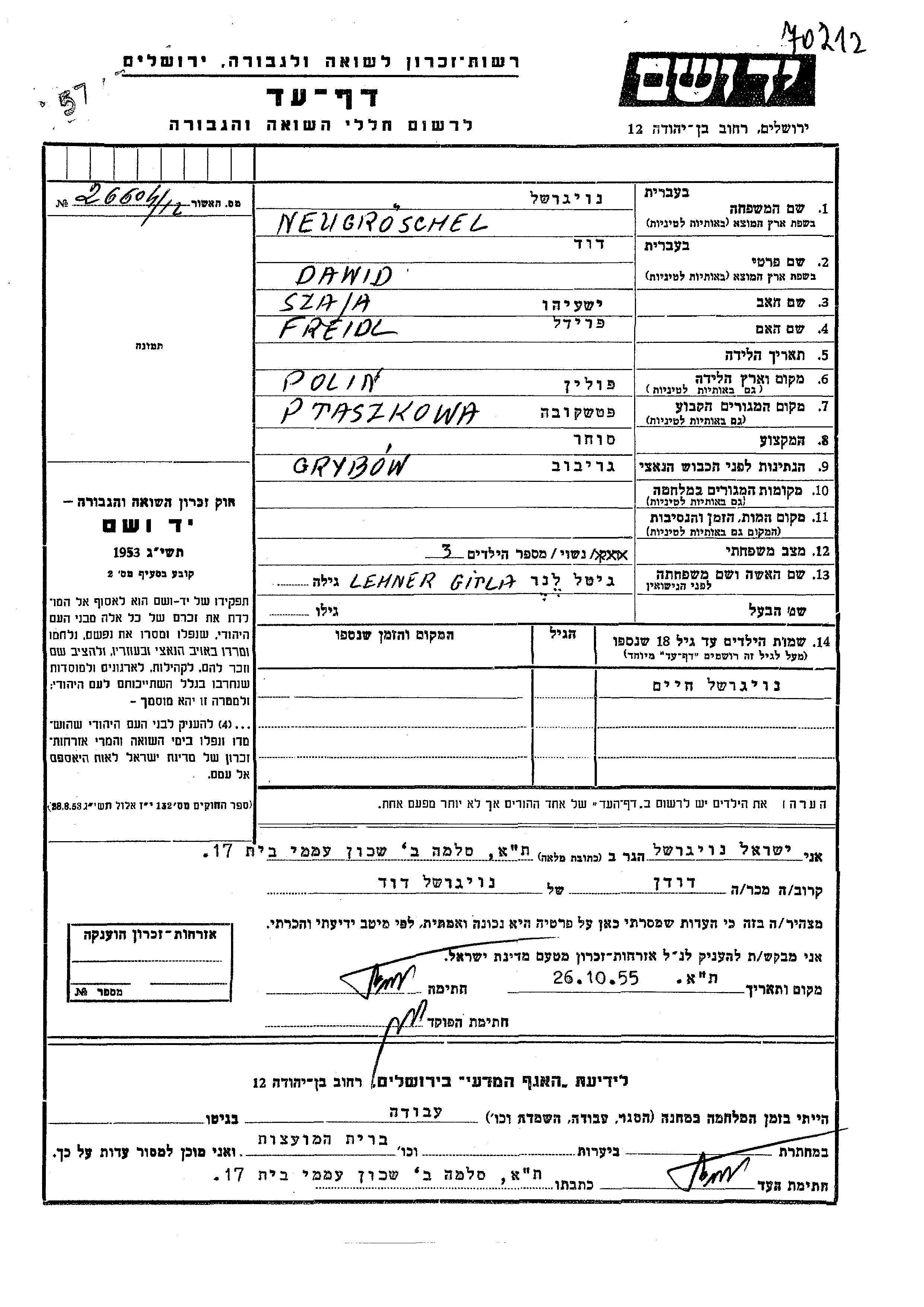 Давид Нойгрёшель, место рождения: Польша. Отец: Шая, mать:Фрейдл Фридл. Торговец / торговка. Женат / замужем. Место жительства до войны: Пташкова, Польша.