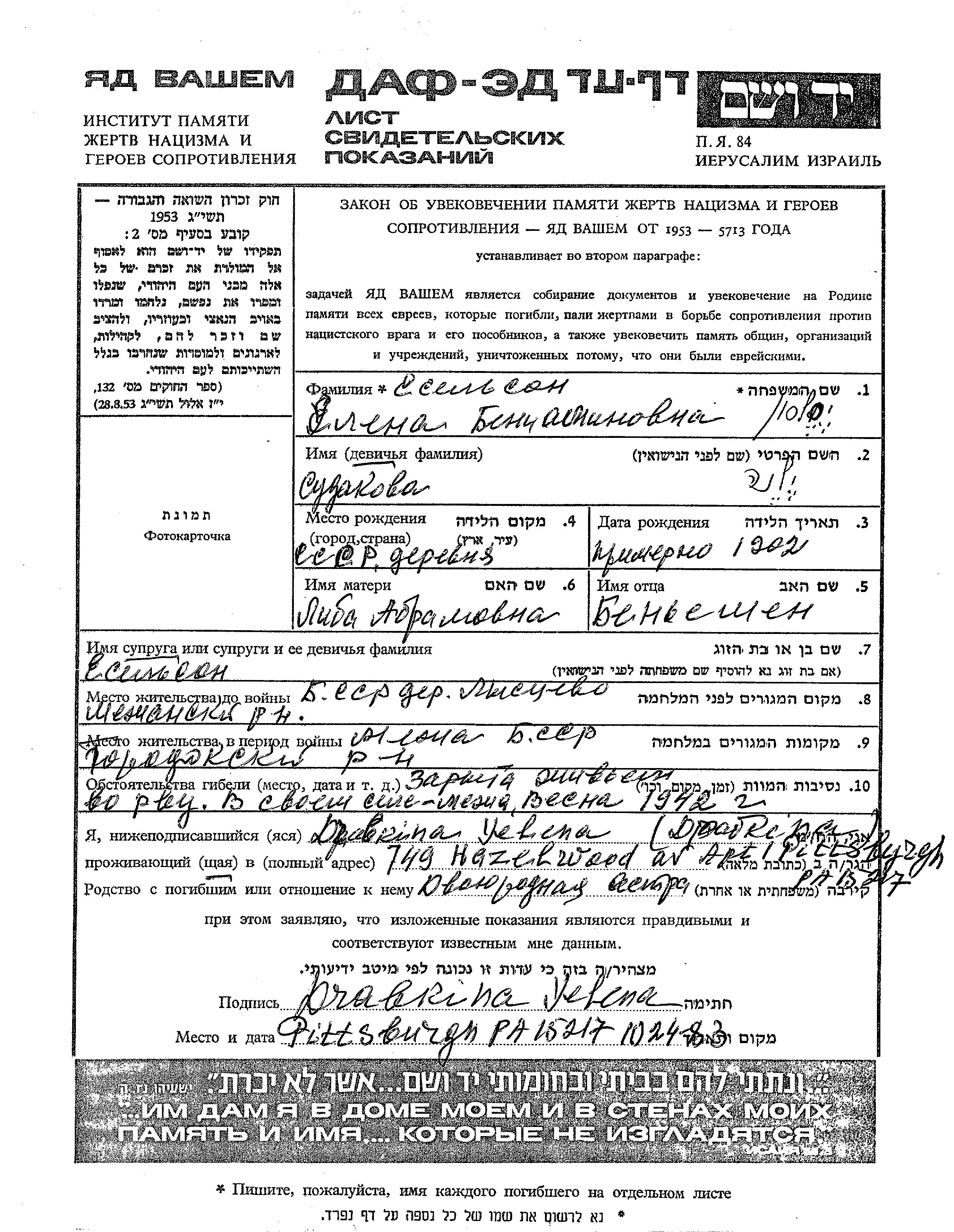 Есельсон Елена 1902 Лысцево, Белоруссия (СССР) Лист свидетельских показаний