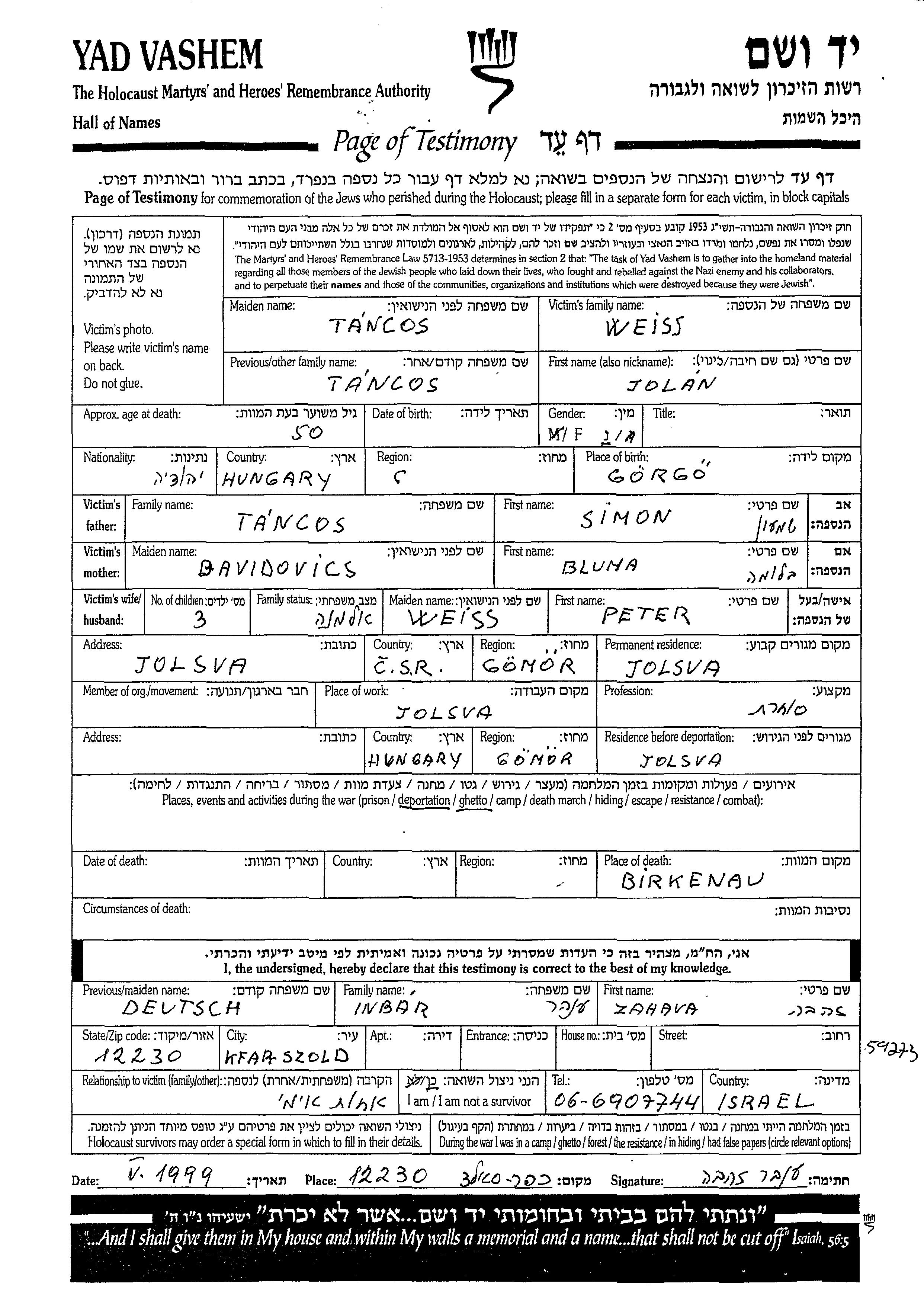 Йолан Вайсс, девичья фамилия Танцош, место рождения: Гёргё, Чехословакия. Отец: Симон, mать:Блюма. Торговец / торговка. Вдова. Место жительства до войны: Йольшва, Чехословакия. Место во время войны: Йольшва, Чехословакия.