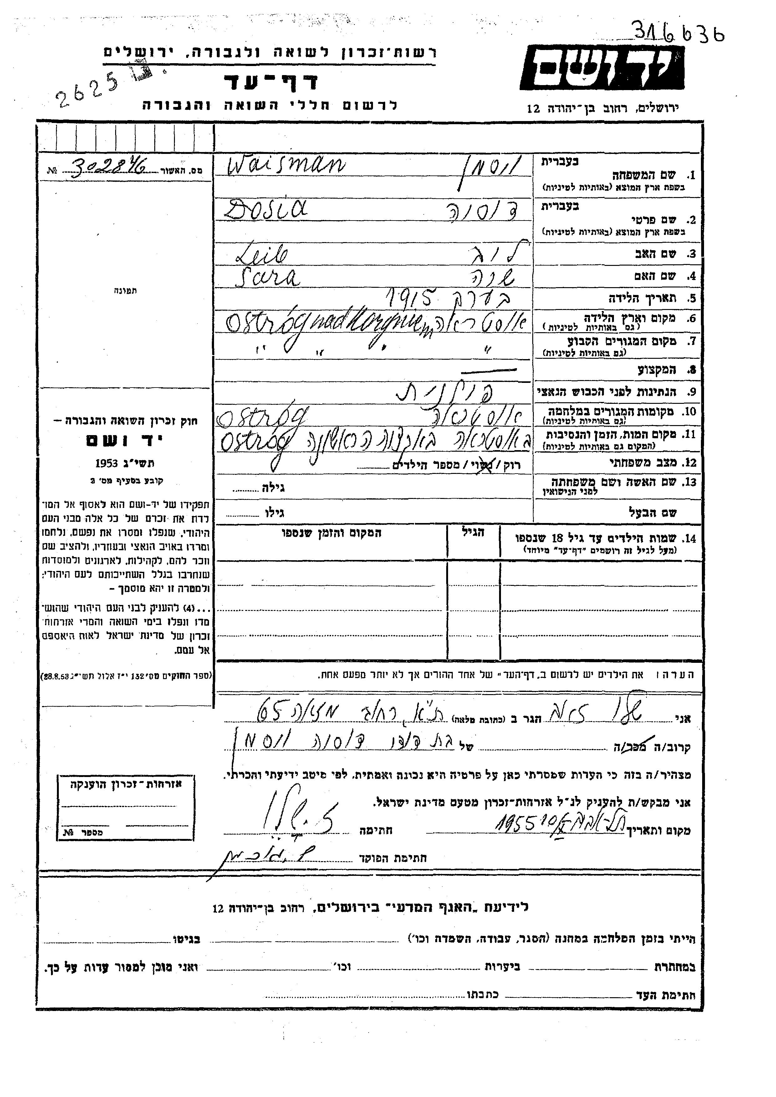 Дося Дуся Вайсман, место рождения: Острог на Горыне, Польша. Отец: Лейб, mать:Сара. Женат / замужем. Место жительства до войны: Острог на Горыне, Польша. Место во время войны: Острог на Горыне, Польша.